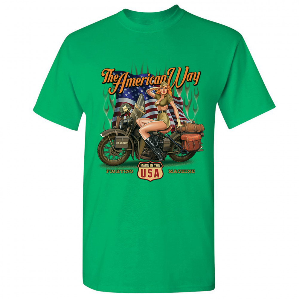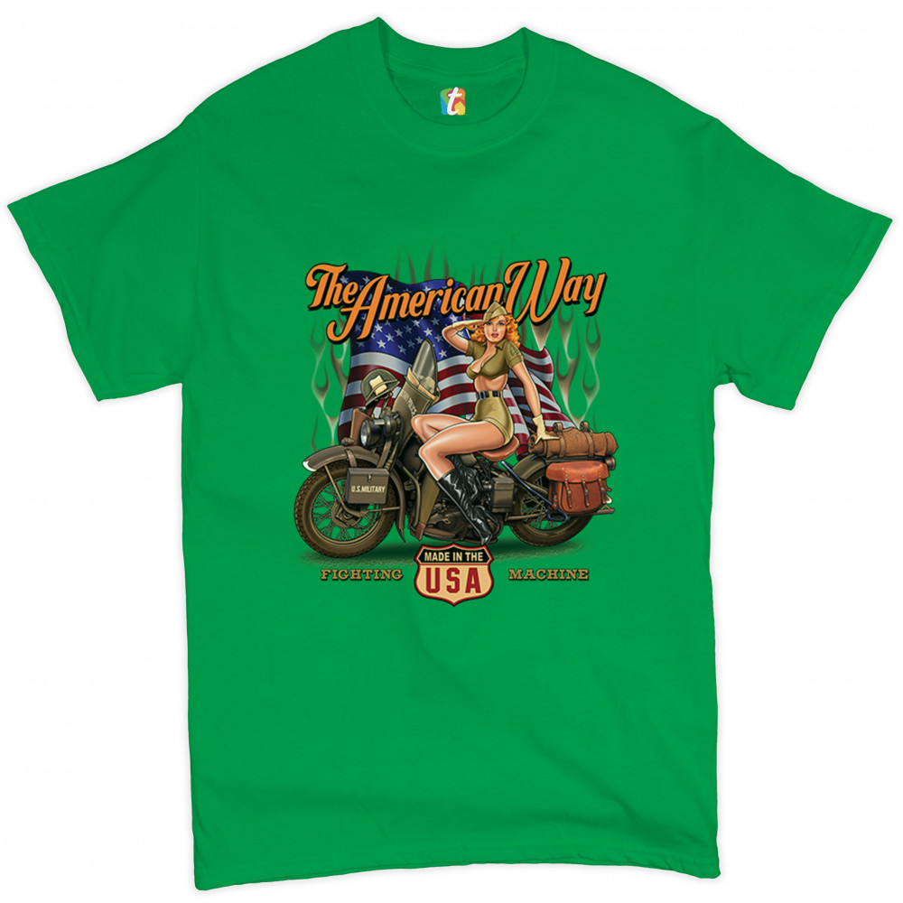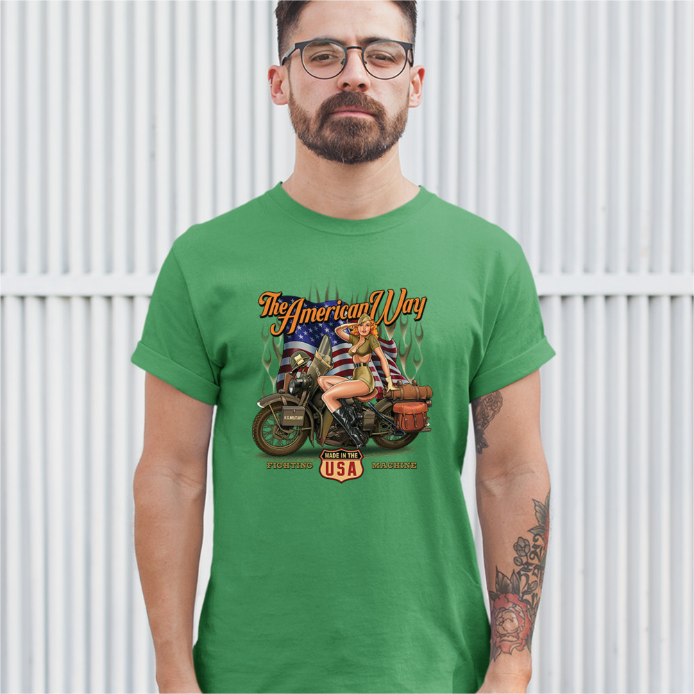 A print featuring a beautiful pin-up girl in leather boots sitting on a U.S. military motorcycle. There is the American Flag in the background and the words "The American Way" above it. At the bottom of the picture there is a shield which says: "made in the USA". "Fighting Machine" is written under the motorcycle's wheels. A great choice for a motorcycle enthusiast.