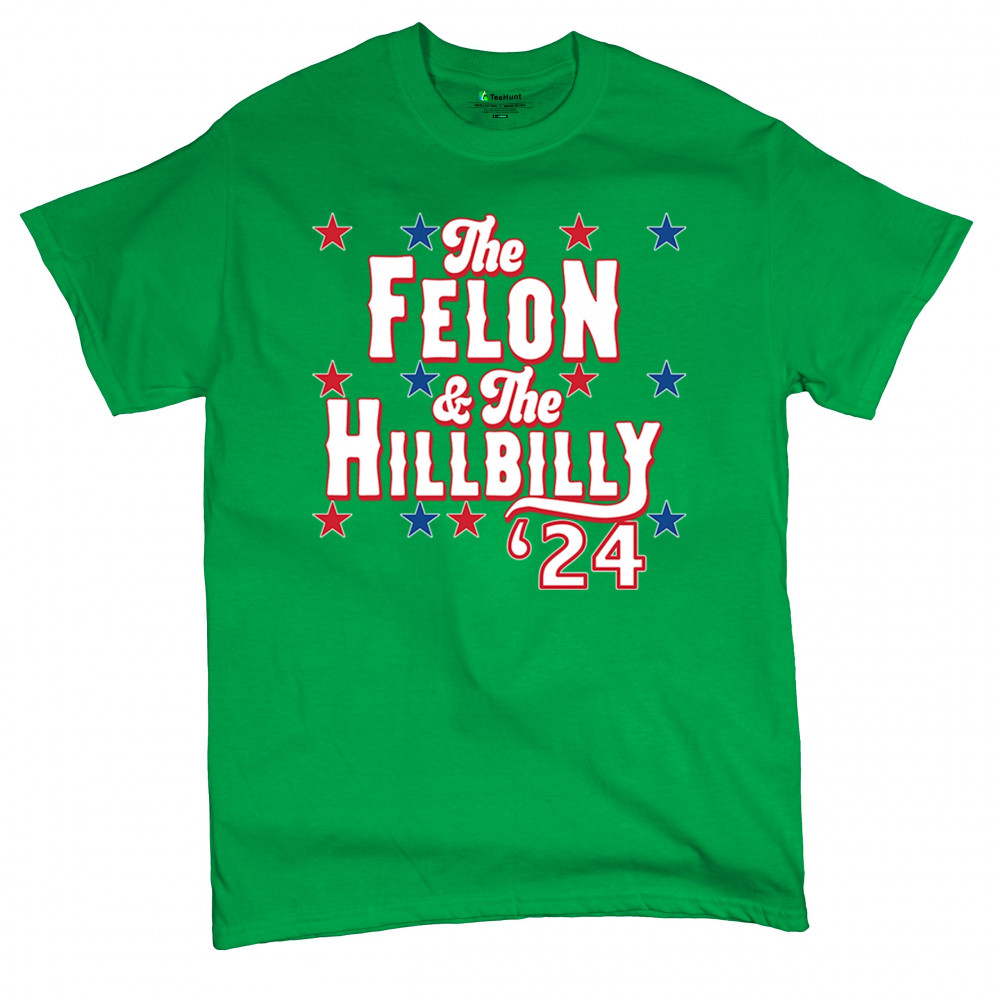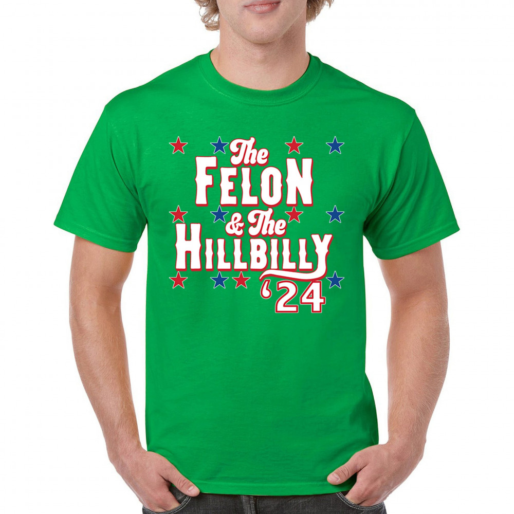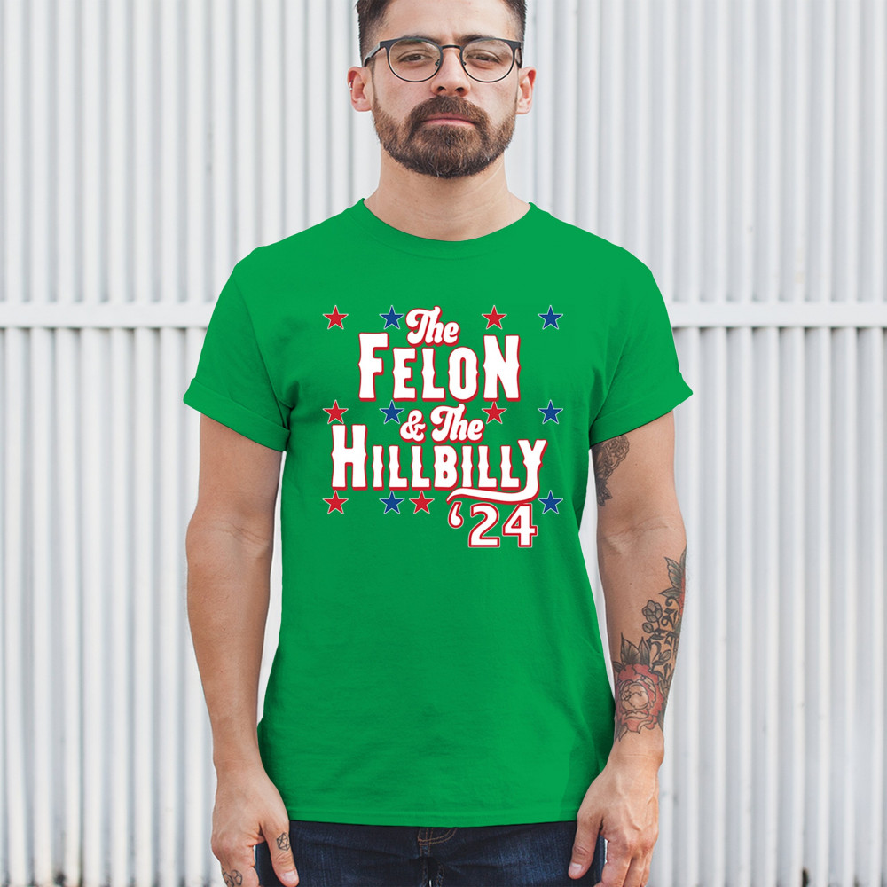 Humorous pro-Trump and Vance design for the 2024 election. "The Felon & The Hillbilly '24" captures conservative pride and humor in one bold statement.