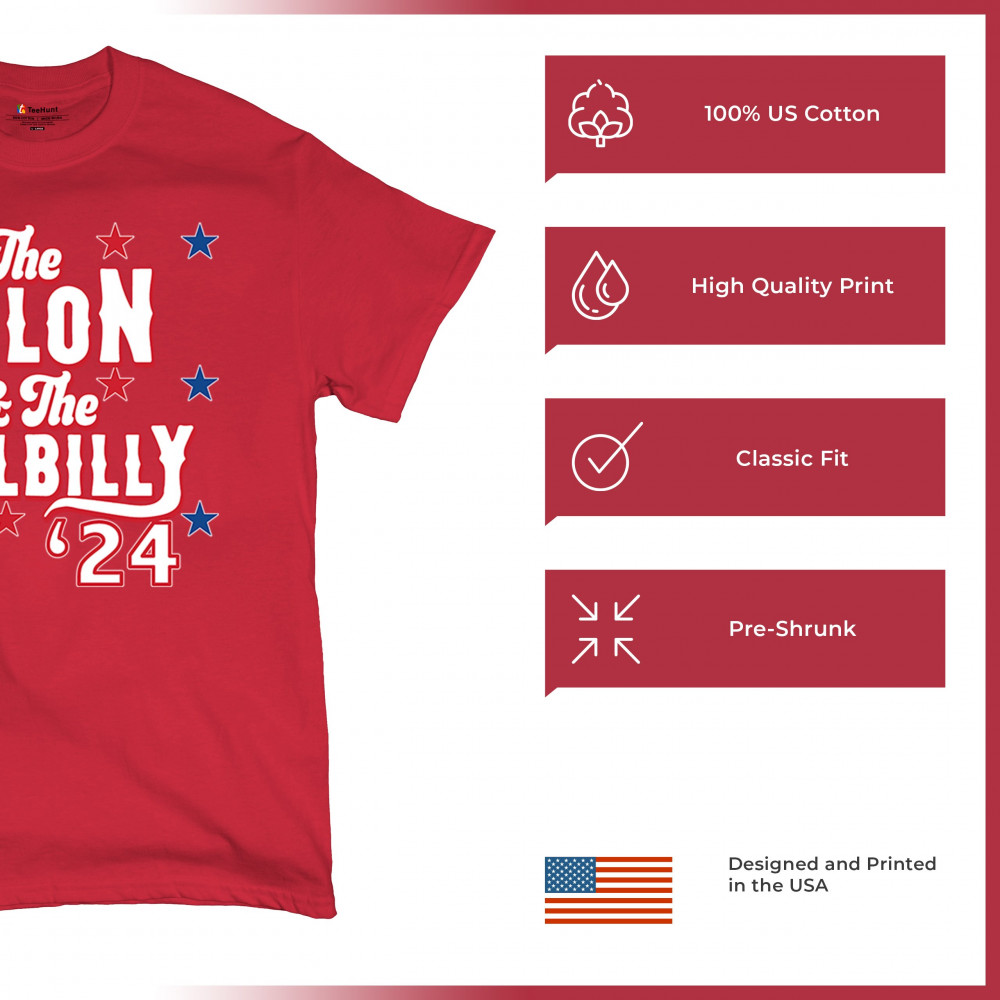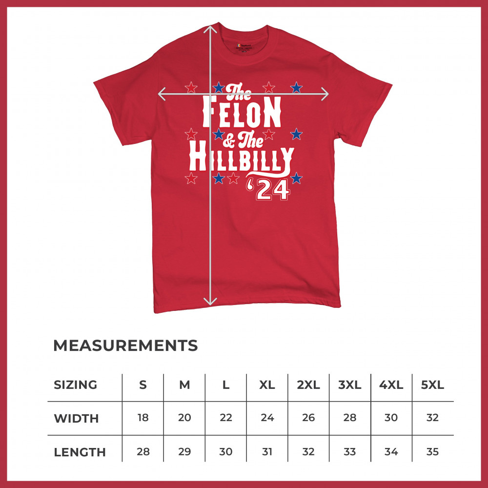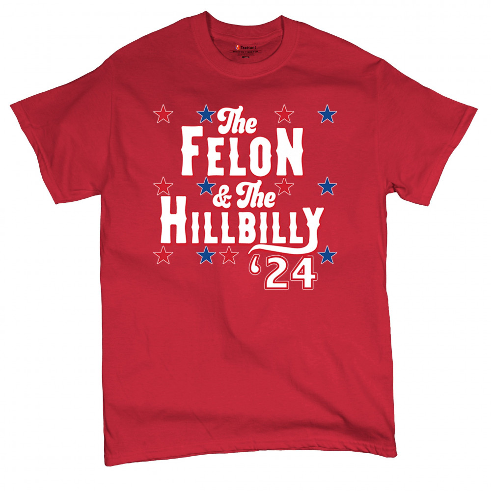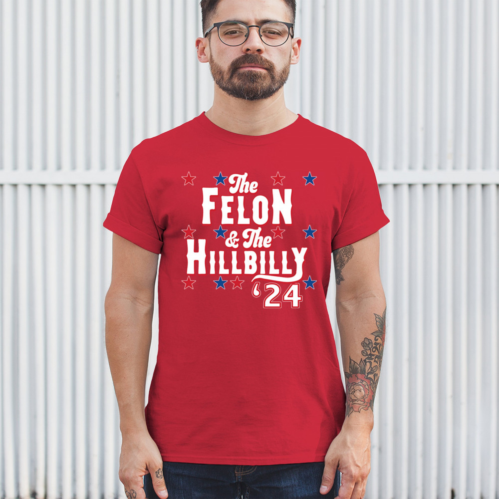 Humorous pro-Trump and Vance design for the 2024 election. "The Felon & The Hillbilly '24" captures conservative pride and humor in one bold statement.