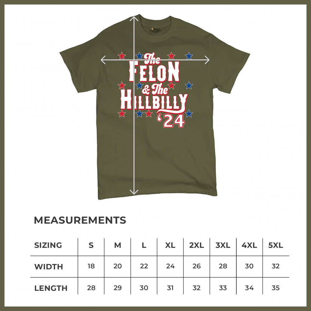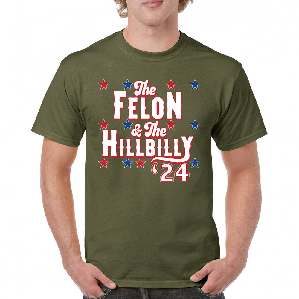 Humorous pro-Trump and Vance design for the 2024 election. "The Felon & The Hillbilly '24" captures conservative pride and humor in one bold statement.