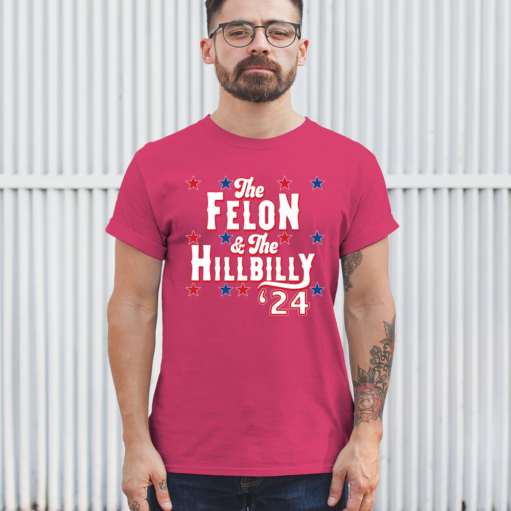 Humorous pro-Trump and Vance design for the 2024 election. "The Felon & The Hillbilly '24" captures conservative pride and humor in one bold statement.