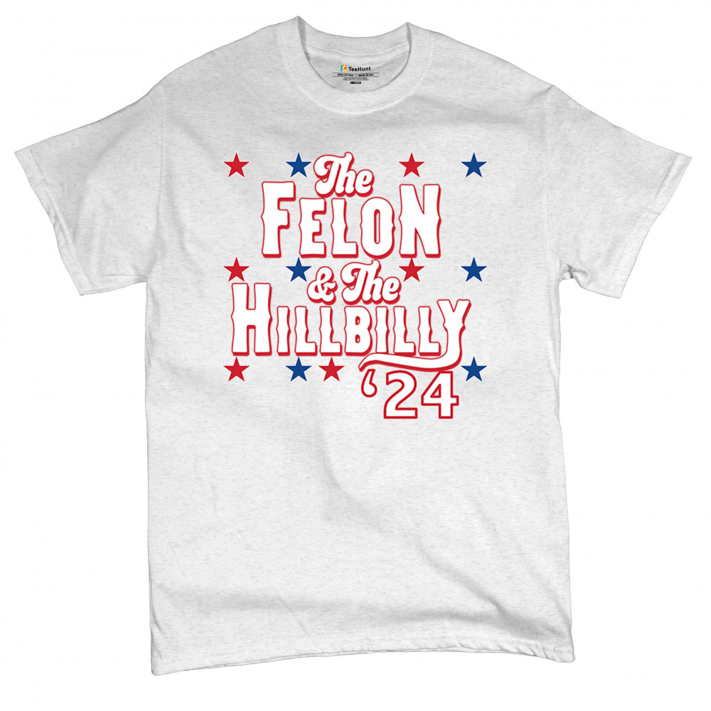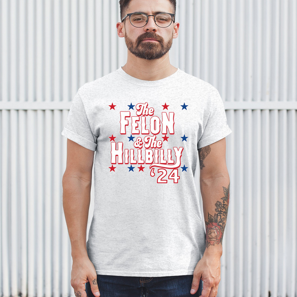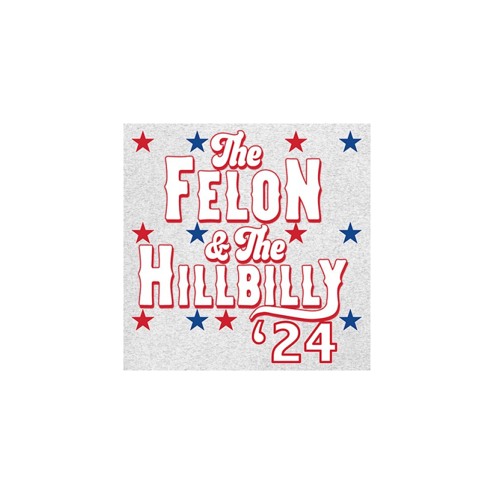 Humorous pro-Trump and Vance design for the 2024 election. "The Felon & The Hillbilly '24" captures conservative pride and humor in one bold statement.