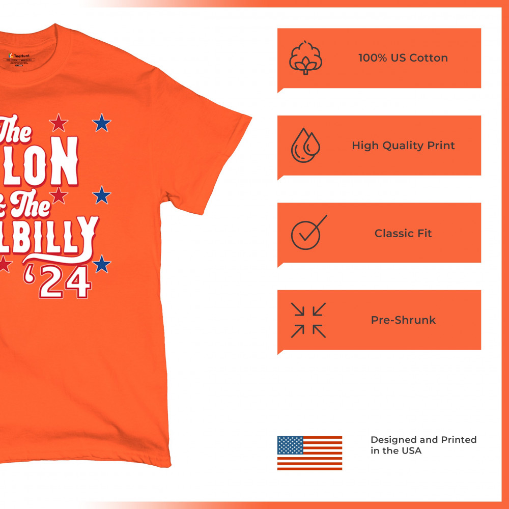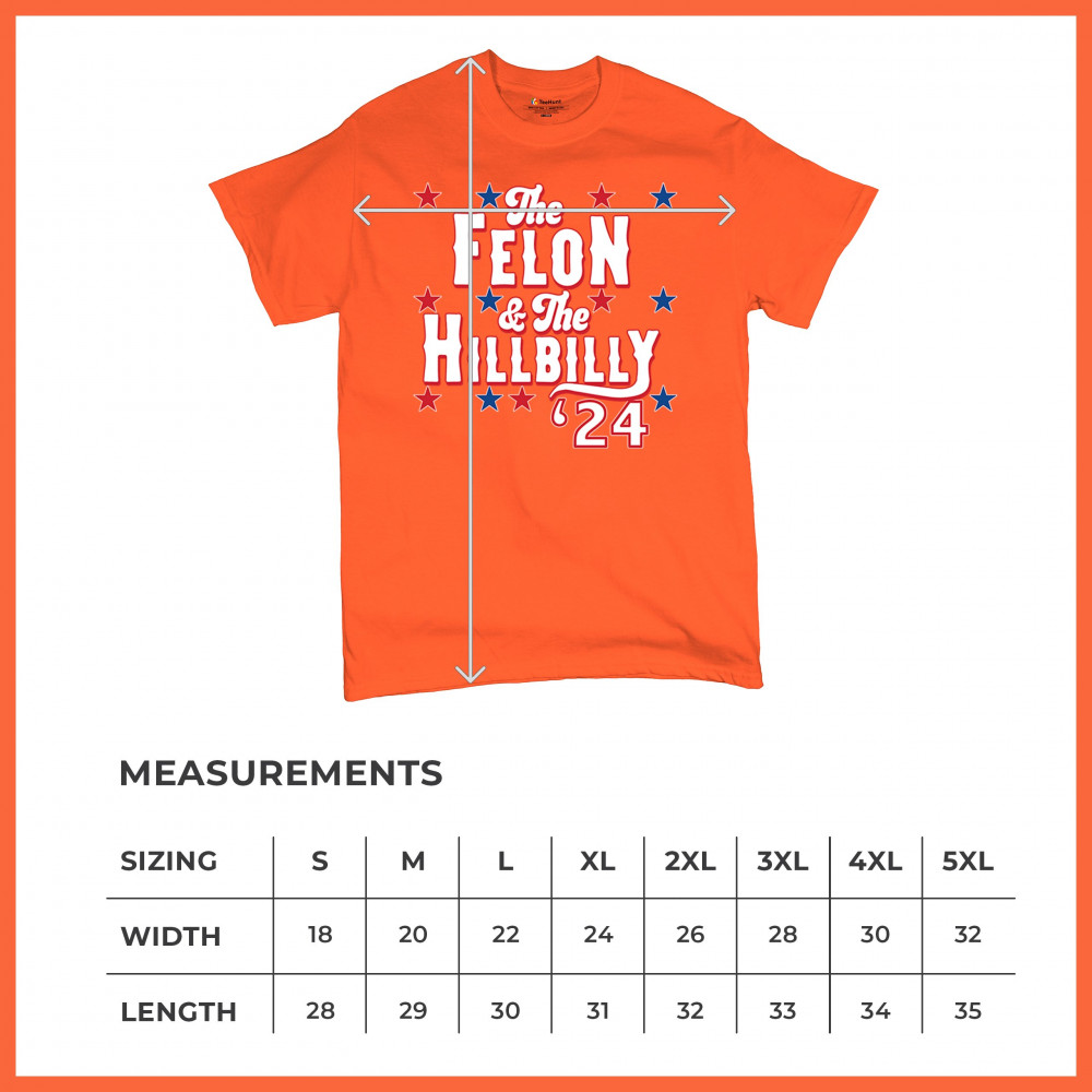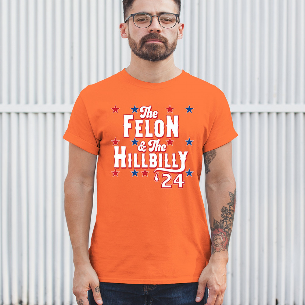 Humorous pro-Trump and Vance design for the 2024 election. "The Felon & The Hillbilly '24" captures conservative pride and humor in one bold statement.