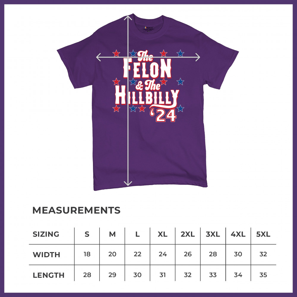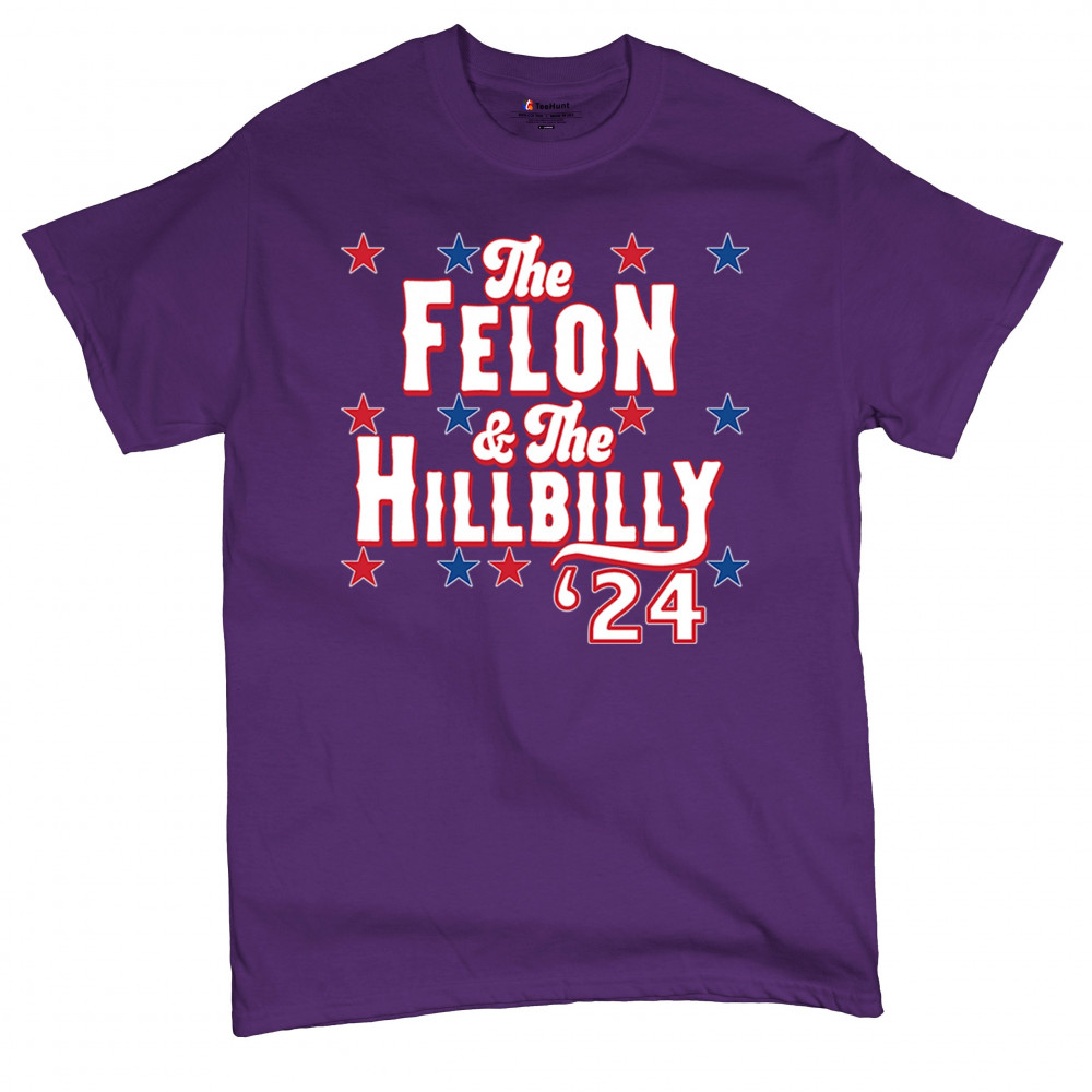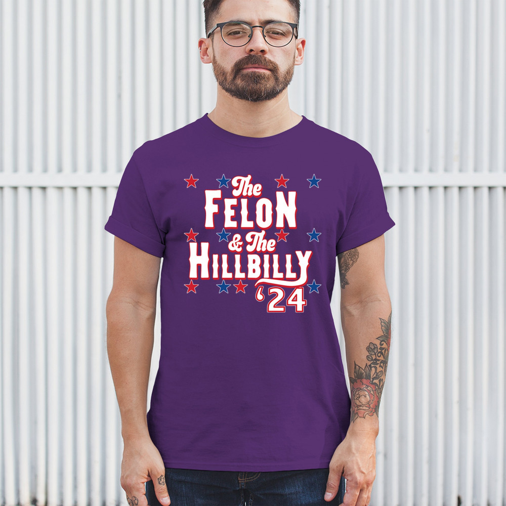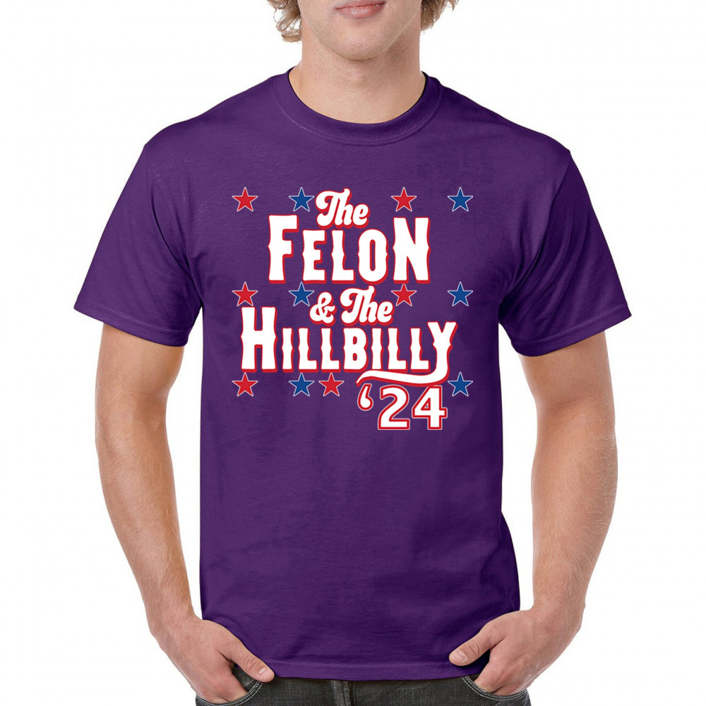 Humorous pro-Trump and Vance design for the 2024 election. "The Felon & The Hillbilly '24" captures conservative pride and humor in one bold statement.
