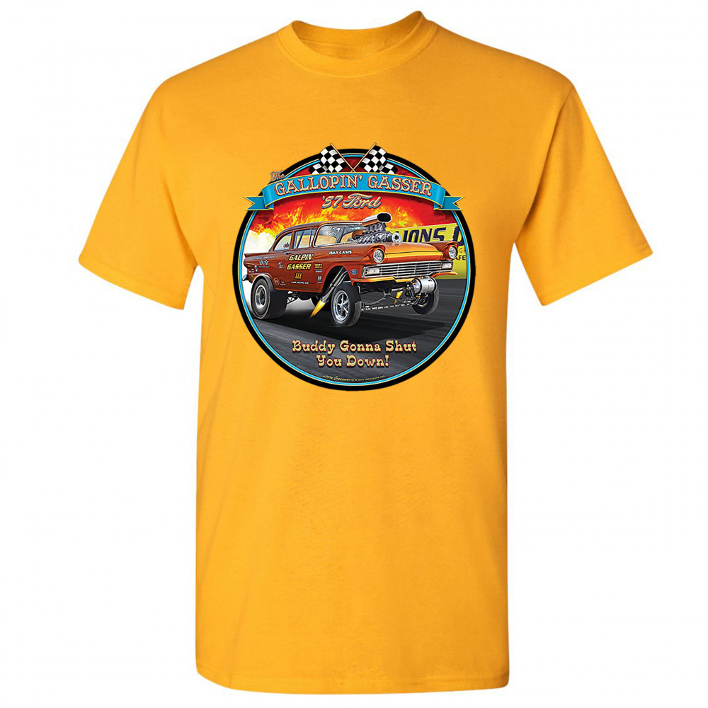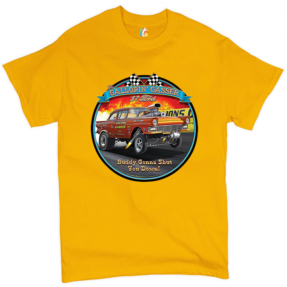 A print featuring a supercharged Ford Gasser sprinting on it's rear wheels in a drag race leaving burning tracks behind it. The print also features a pair of racing flags and says: "The Gallopin' Gasser '57 Ford" and "Buddy Gonna Shut You Down!". A great