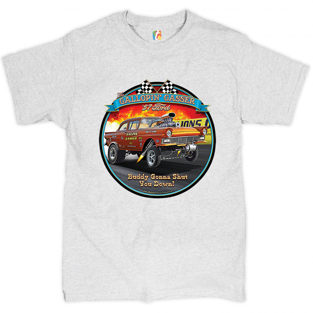 A print featuring a supercharged Ford Gasser sprinting on it's rear wheels in a drag race leaving burning tracks behind it. The print also features a pair of racing flags and says: "The Gallopin' Gasser '57 Ford" and "Buddy Gonna Shut You Down!". A great