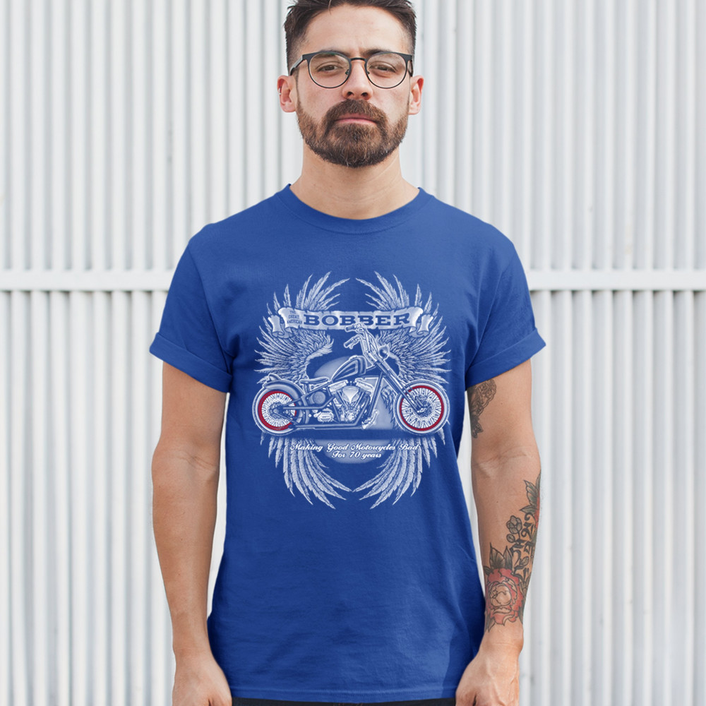 A print featuring a bobber motorcycle and a pair of wings in the background. At the top there is a stripe with "The great American bobber" written on it. At the bottom the print says: "making good motorcycles bad for 70 years". A great choice for a motorc