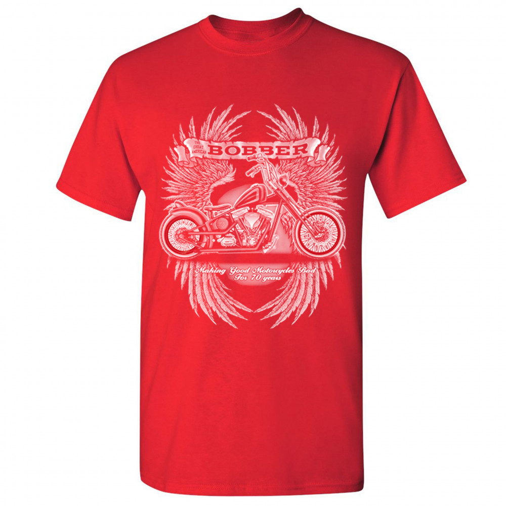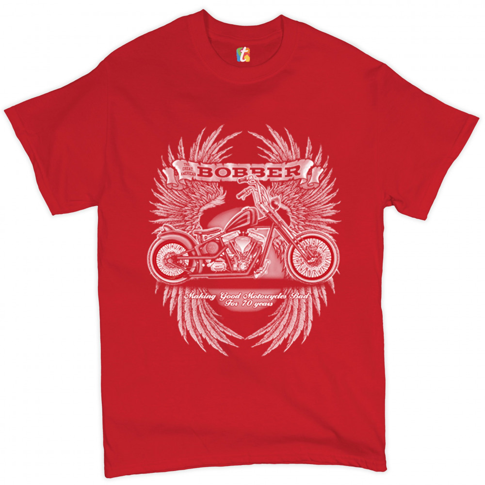 A print featuring a bobber motorcycle and a pair of wings in the background. At the top there is a stripe with "The great American bobber" written on it. At the bottom the print says: "making good motorcycles bad for 70 years". A great choice for a motorc
