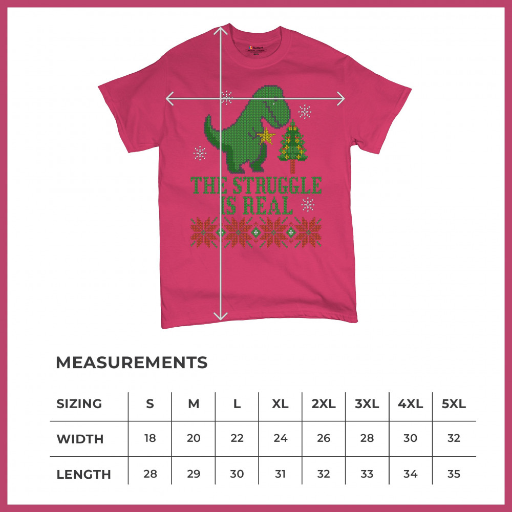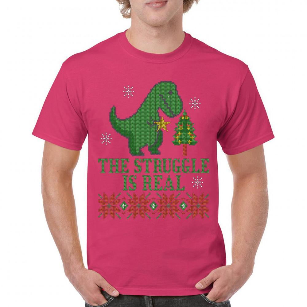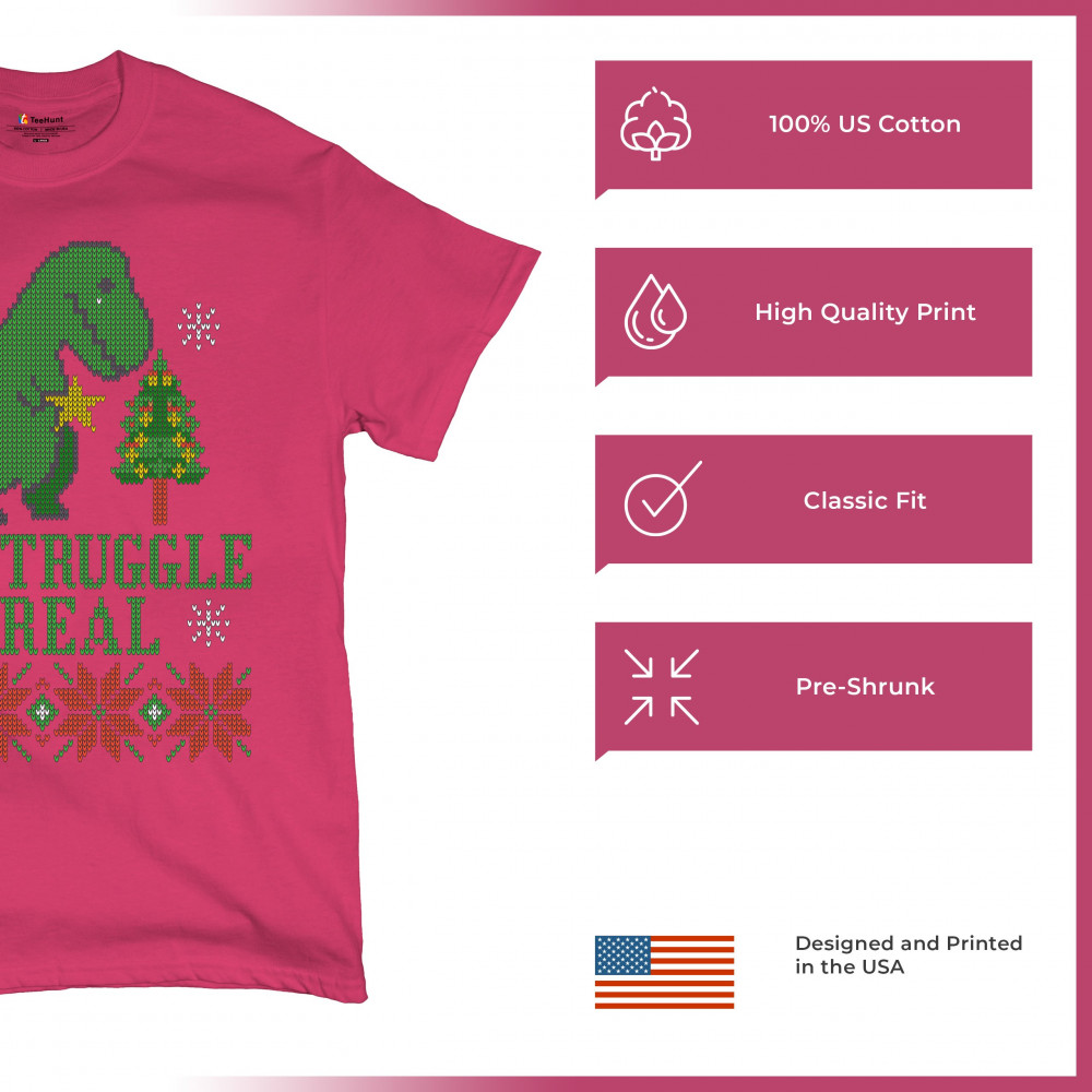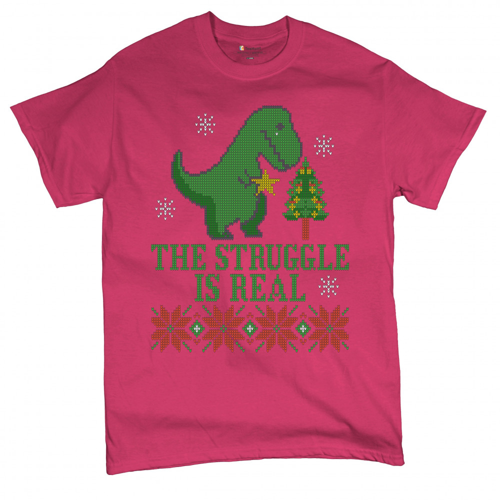 A funny print saying: "The Struggle Is Real" and featuring a sad tyrannosaurus rex holding a toy star in it's short hands standing by a Christmas tree. The print is decorated as an ugly sweater. Amazing choice to make people smile and spread positive vibe
