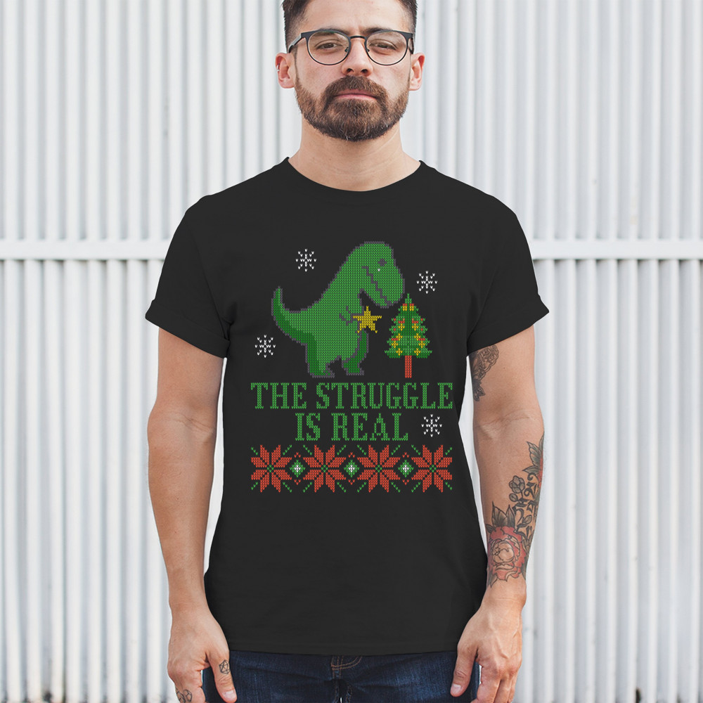A funny print saying: "The Struggle Is Real" and featuring a sad tyrannosaurus rex holding a toy star in it's short hands standing by a Christmas tree. The print is decorated as an ugly sweater. Amazing choice to make people smile and spread positive vibe