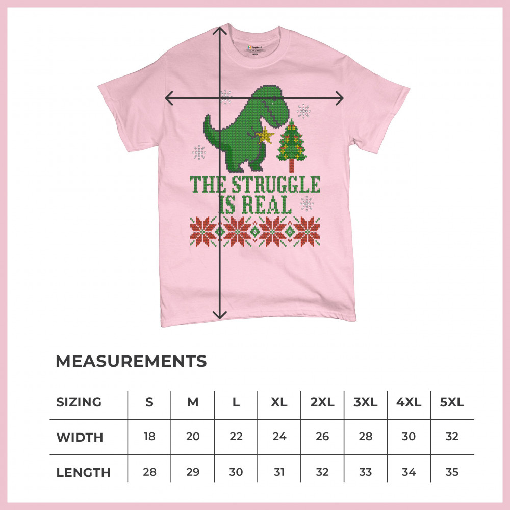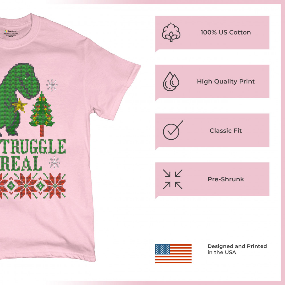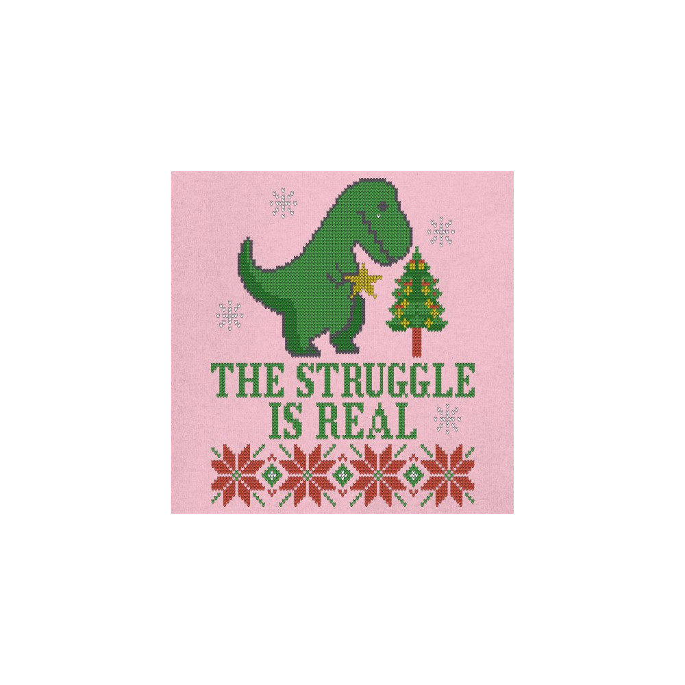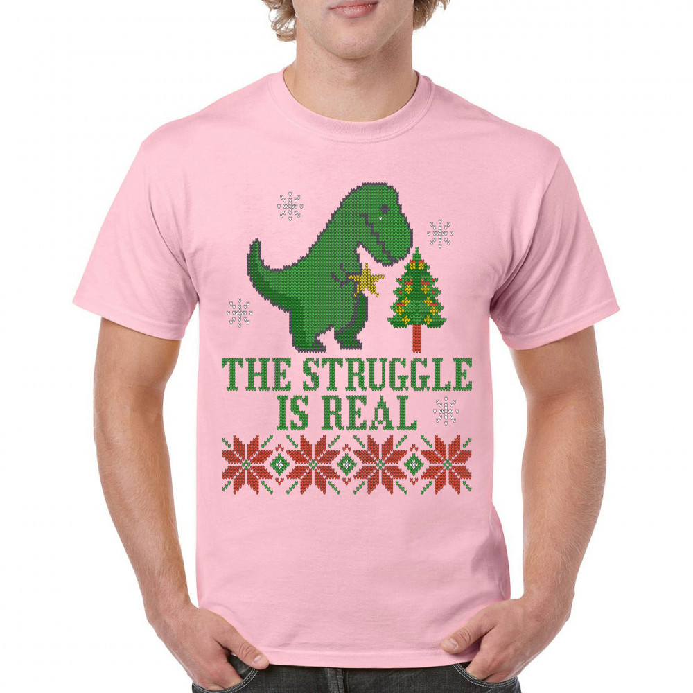 A funny print saying: "The Struggle Is Real" and featuring a sad tyrannosaurus rex holding a toy star in it's short hands standing by a Christmas tree. The print is decorated as an ugly sweater. Amazing choice to make people smile and spread positive vibe