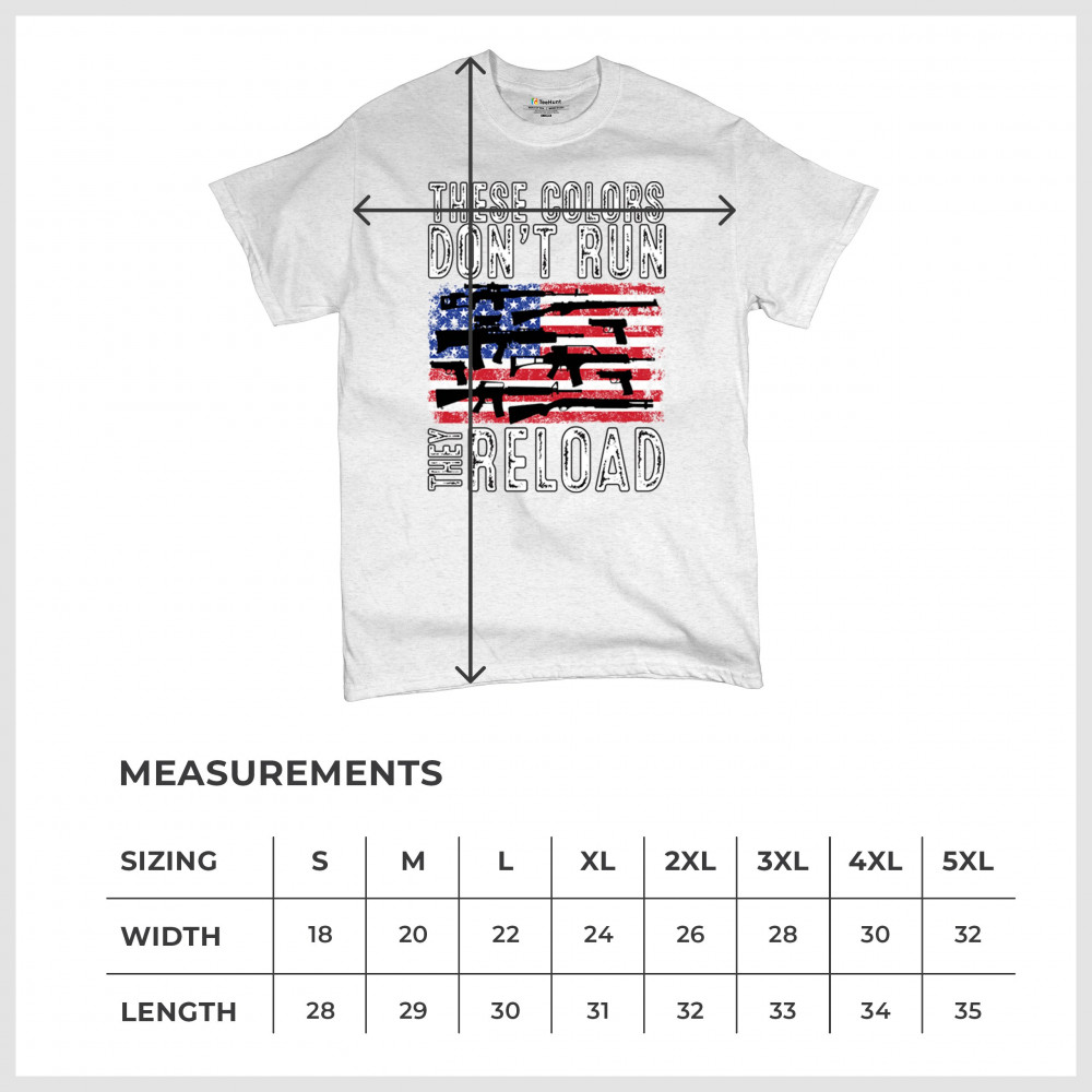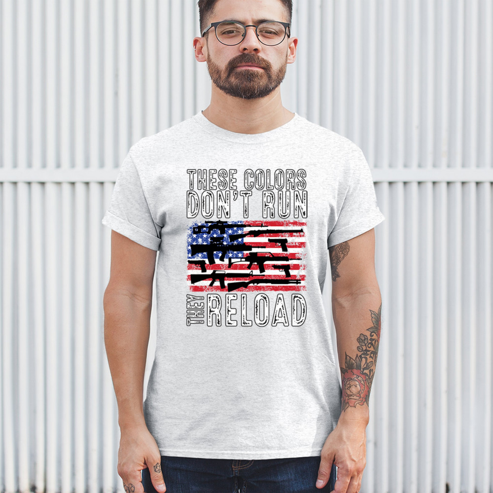 Explore the embodiment of patriotism with our 'These Colors Don't Run, They Reload' tee. A bold statement for those who honor freedom and resilience.