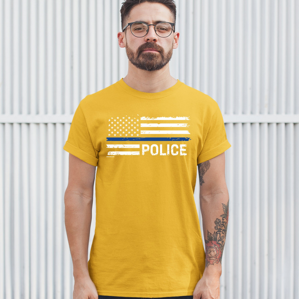 THIN BLUE LINE AMERICAN FLAG t-shirt police law enforcement men's tee yellow