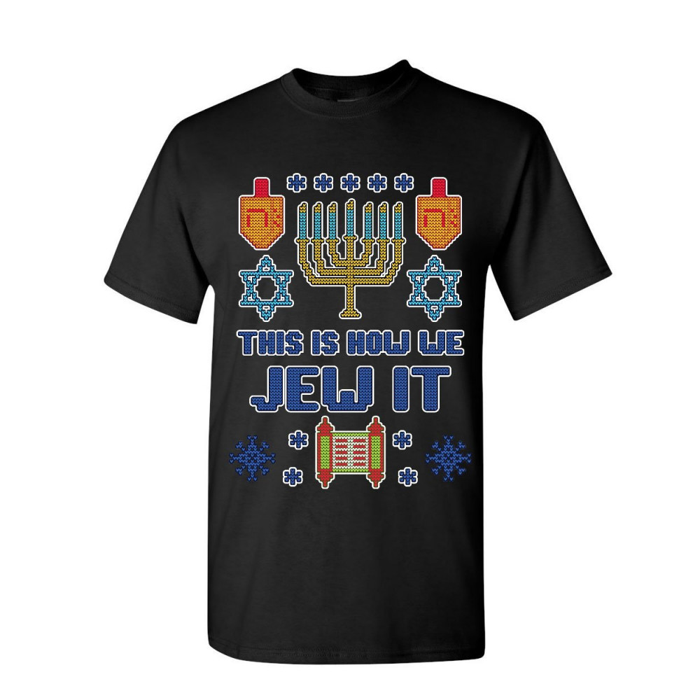 THIS IS HOW WE JEW IT UGLY SWEATER this is how we jew it ugly t-shirt hannukah torah menorah funny mens tee shirt black