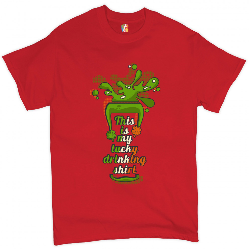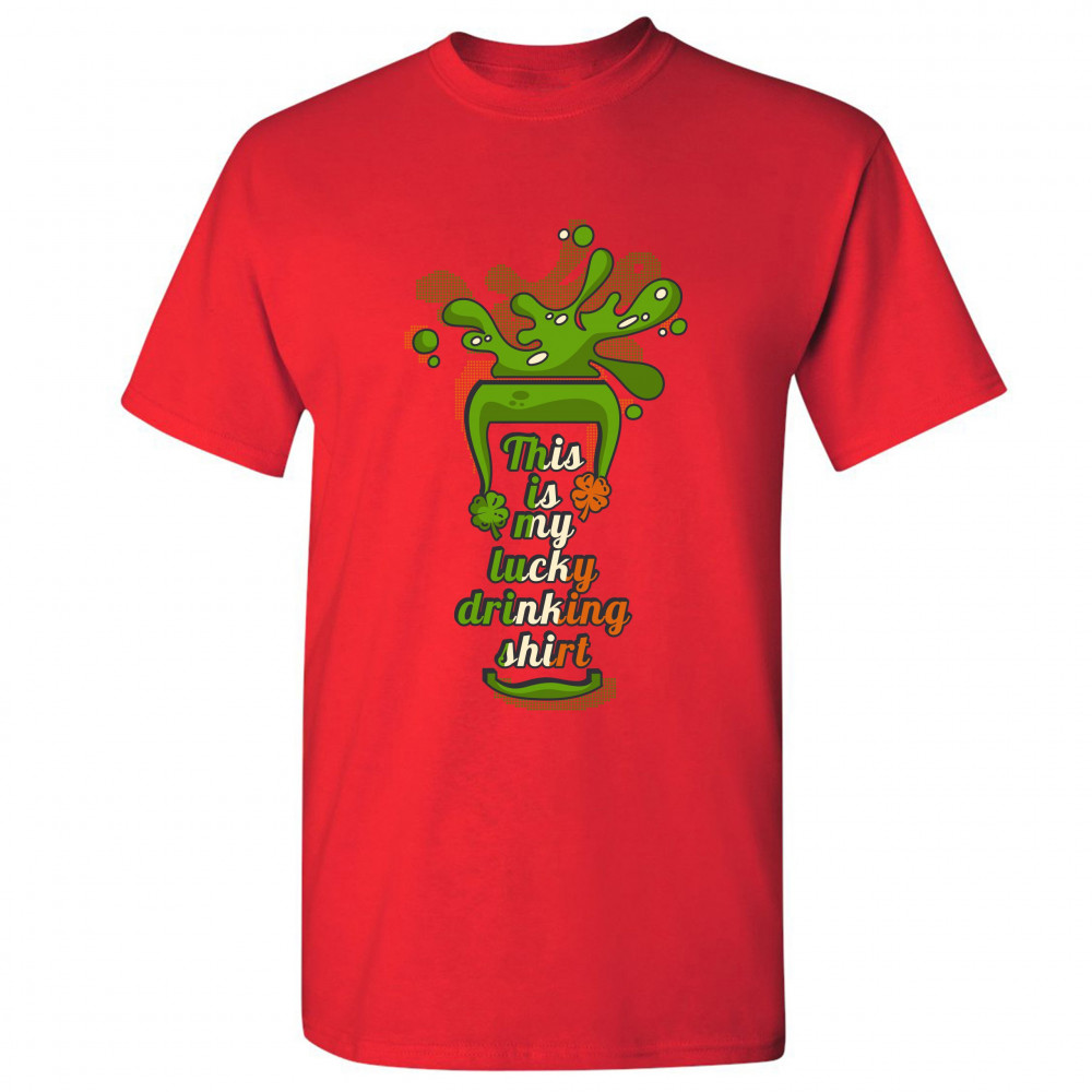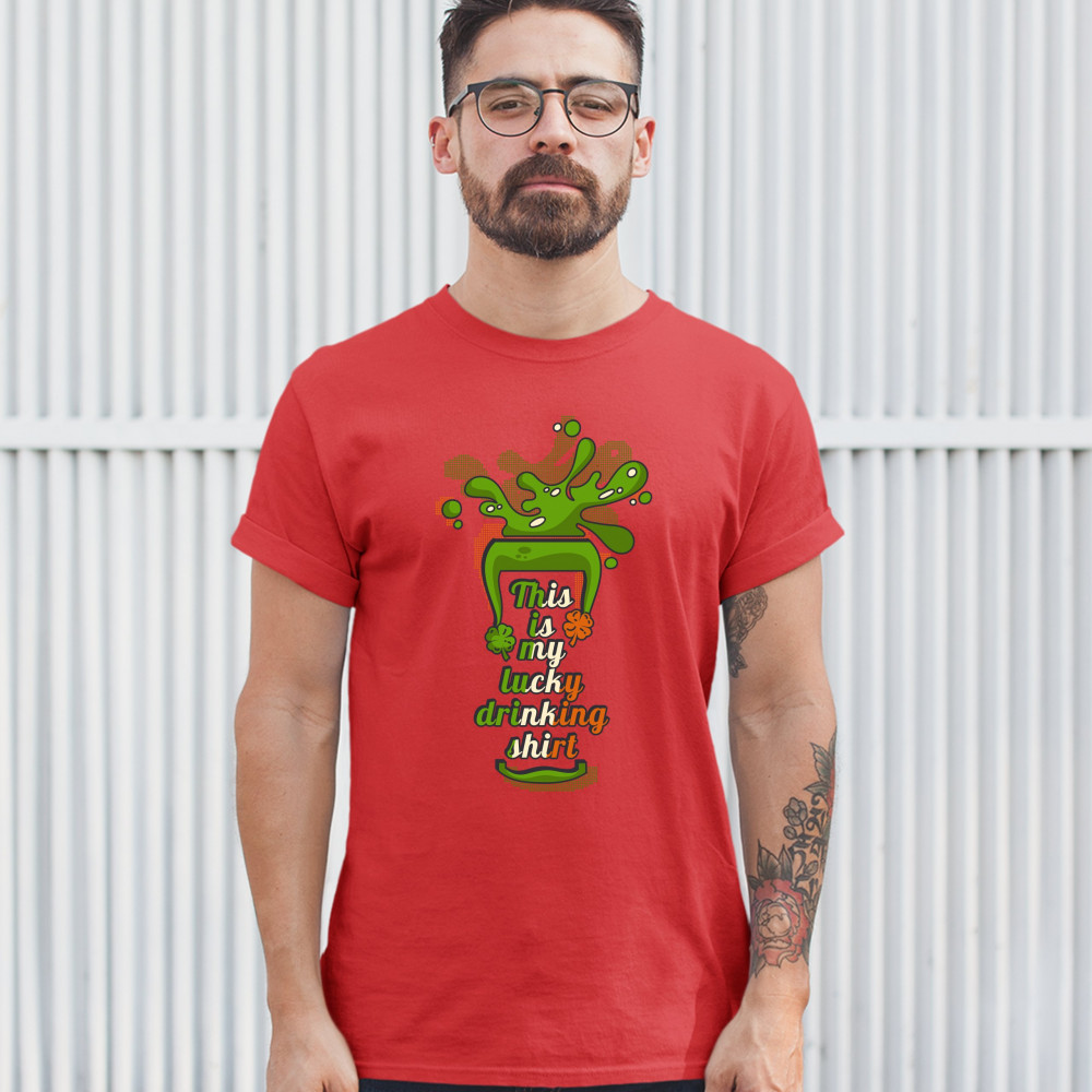 A print featuring a silhouette of a glass with beer spilling out of it. Inside the glass there is a text: "This is my lucky drinking shirt" in the colors of the flag of Ireland. A great choice to wear on March 17 to celebrate the St. Patrick's Day and sho