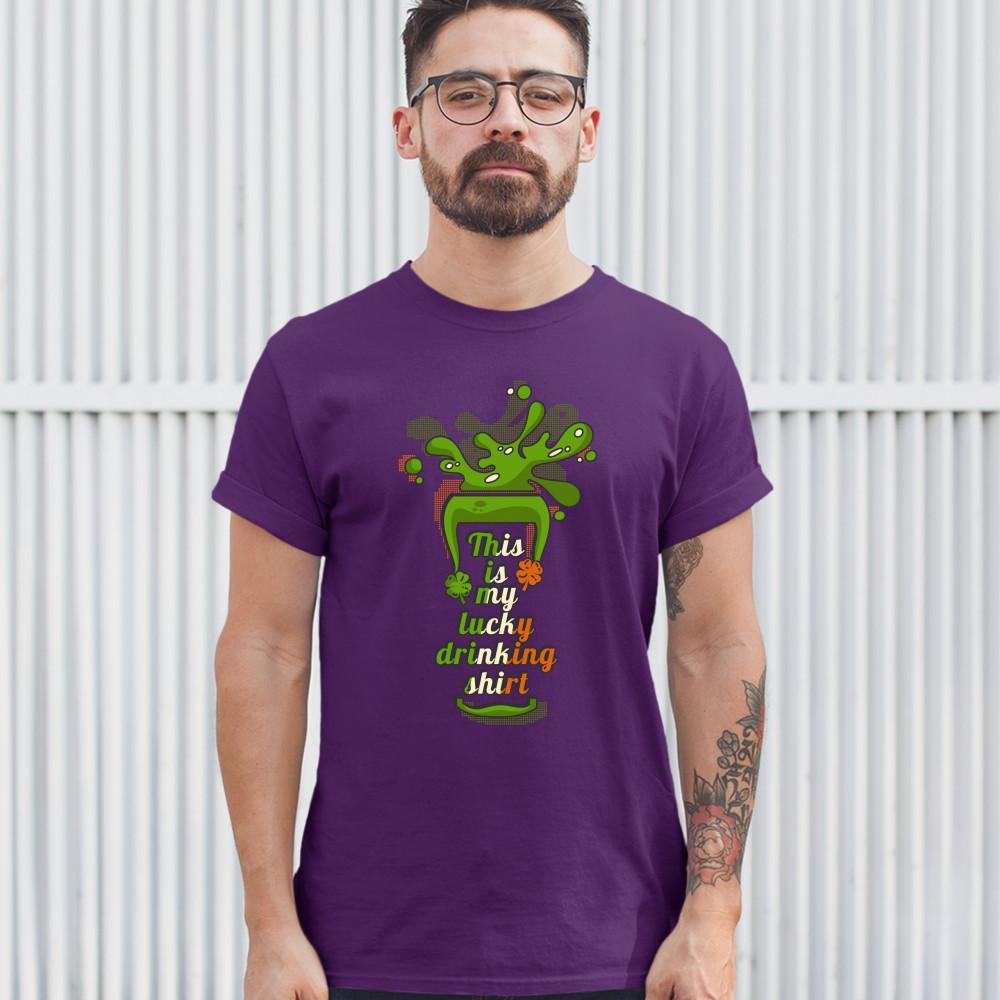 A print featuring a silhouette of a glass with beer spilling out of it. Inside the glass there is a text: "This is my lucky drinking shirt" in the colors of the flag of Ireland. A great choice to wear on March 17 to celebrate the St. Patrick's Day and sho