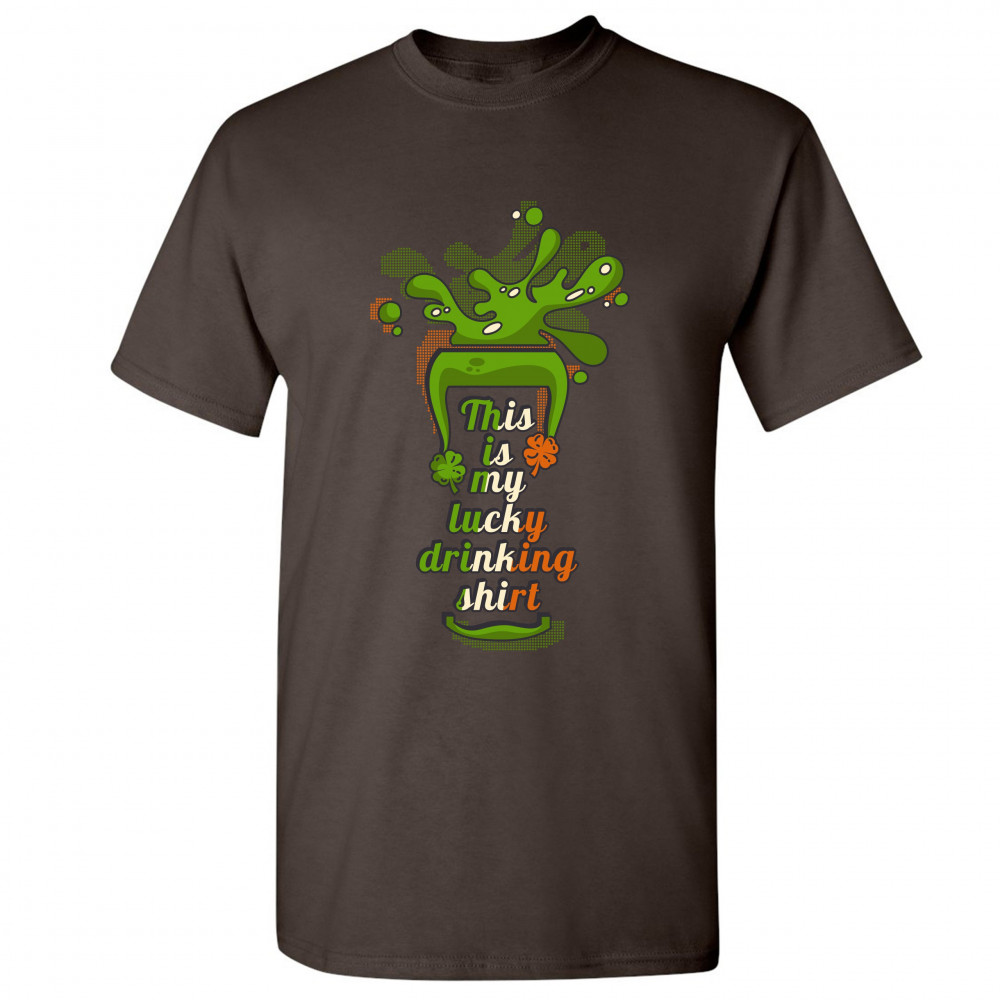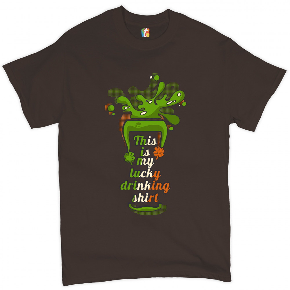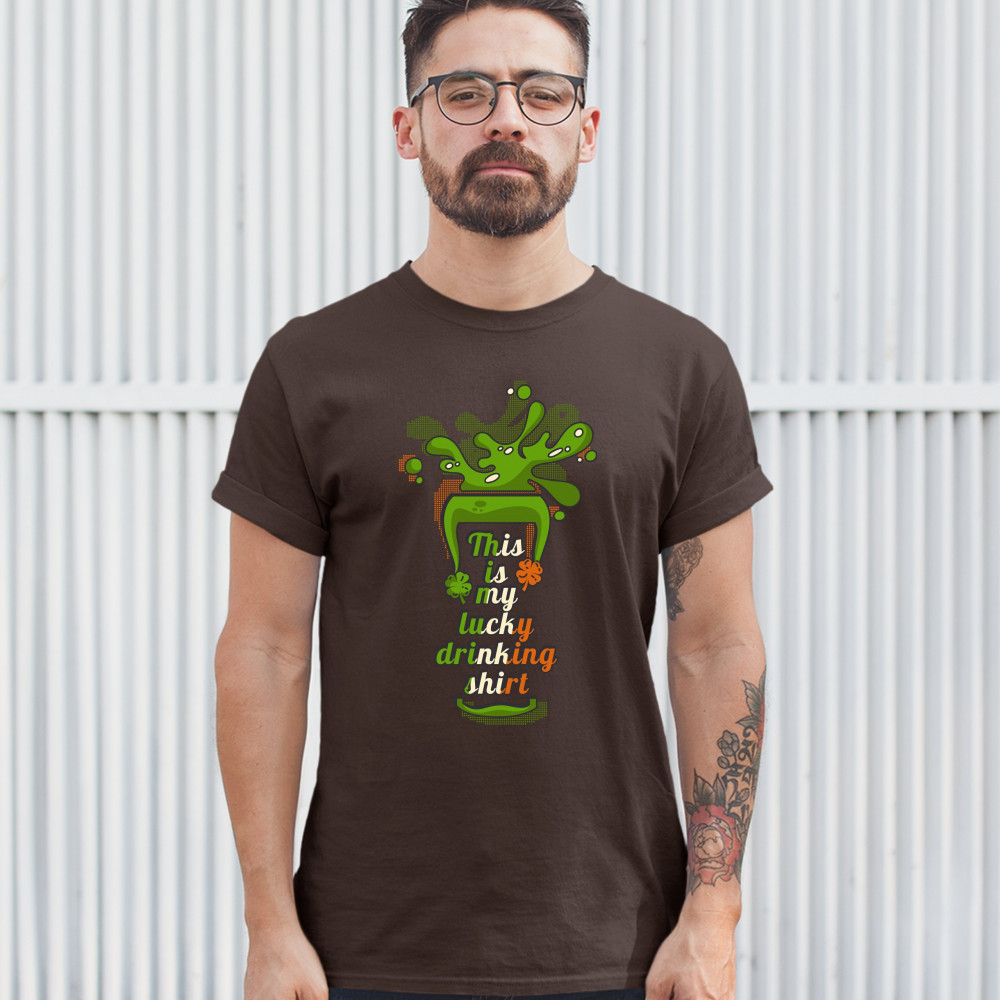 A print featuring a silhouette of a glass with beer spilling out of it. Inside the glass there is a text: "This is my lucky drinking shirt" in the colors of the flag of Ireland. A great choice to wear on March 17 to celebrate the St. Patrick's Day and sho