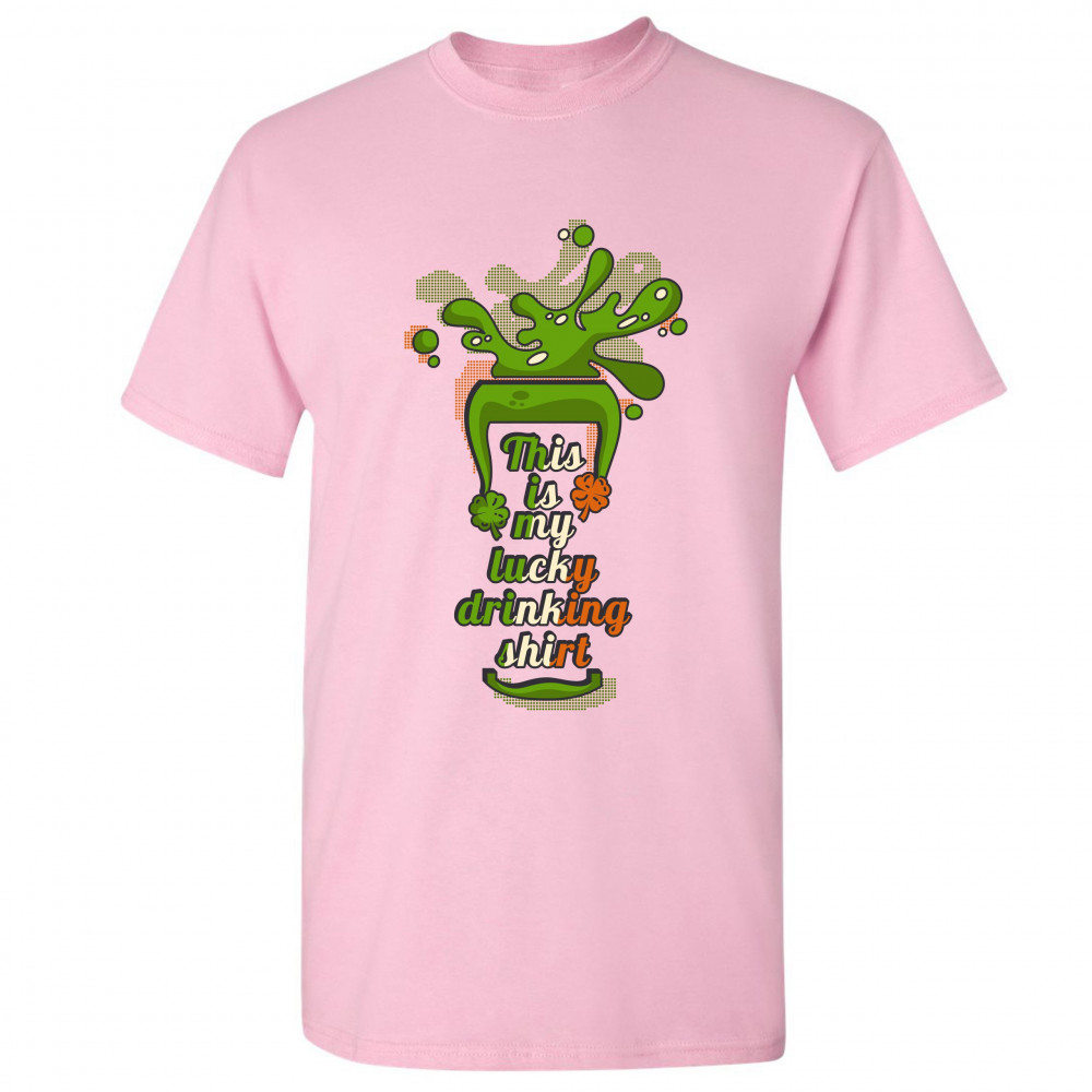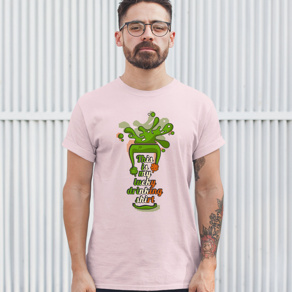 A print featuring a silhouette of a glass with beer spilling out of it. Inside the glass there is a text: "This is my lucky drinking shirt" in the colors of the flag of Ireland. A great choice to wear on March 17 to celebrate the St. Patrick's Day and sho