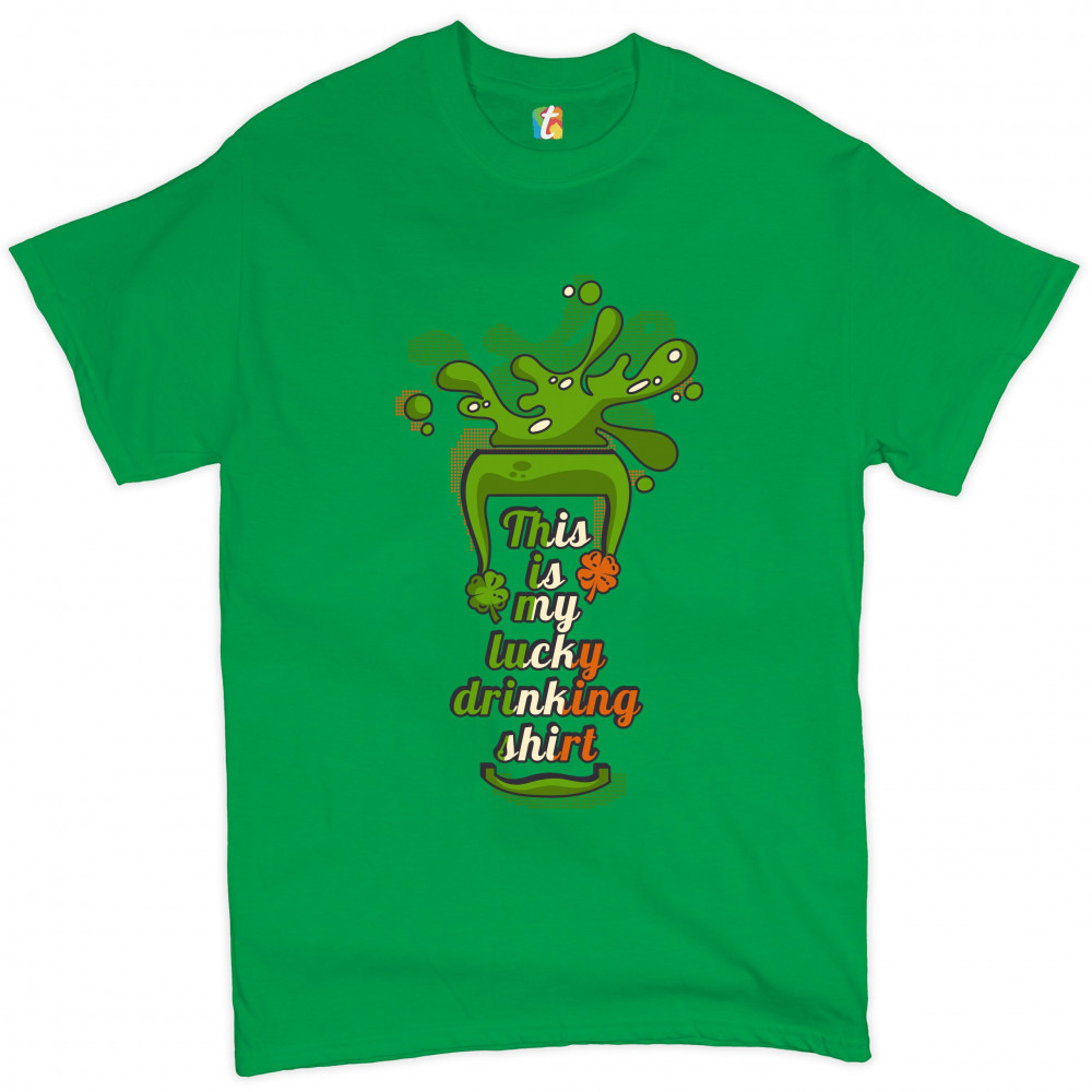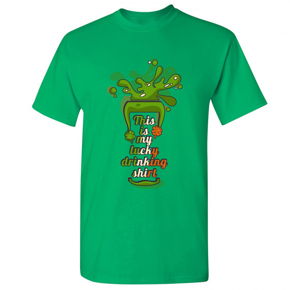 A print featuring a silhouette of a glass with beer spilling out of it. Inside the glass there is a text: "This is my lucky drinking shirt" in the colors of the flag of Ireland. A great choice to wear on March 17 to celebrate the St. Patrick's Day and sho