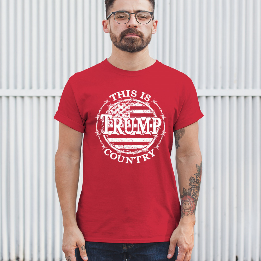 Show your support for Trump and JD Vance with the "Trump Country" design, featuring a distressed American flag and barbed wire. Perfect for rallies and patriotic events.