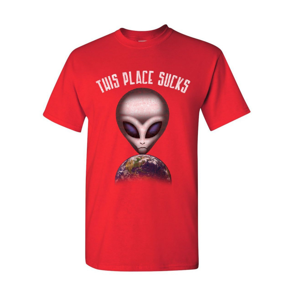 THIS PLACE SUCKS t-shirt funny ufo alien space universe earth mens tee shirt red