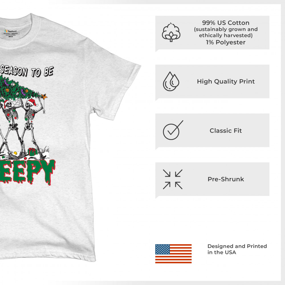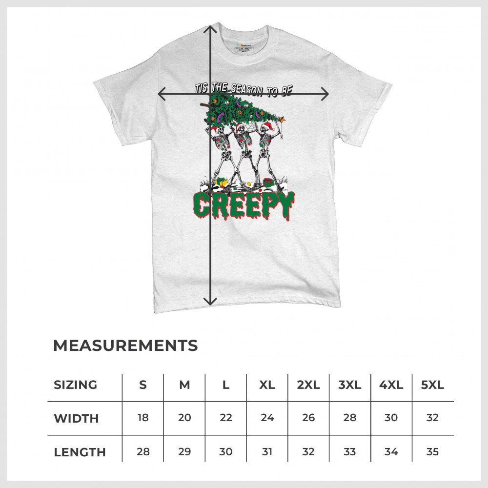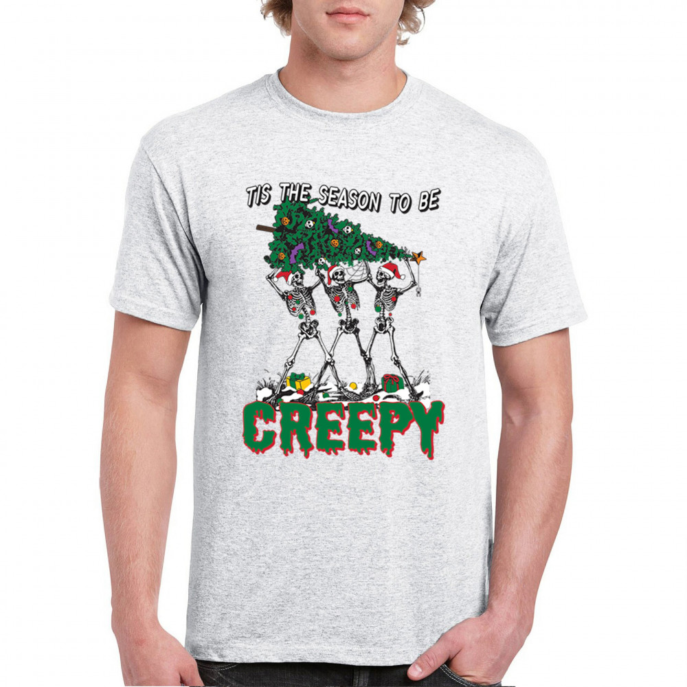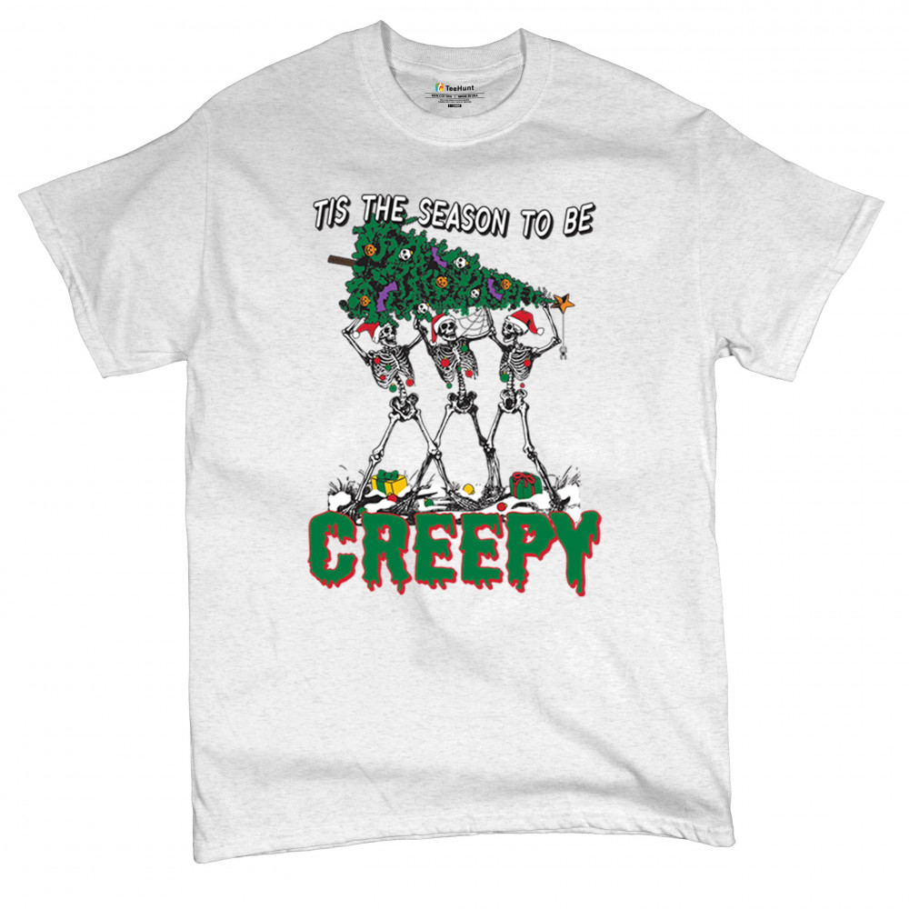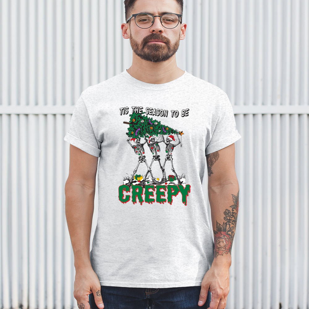 "Tis the Season to Be Creepy" combines holiday cheer with a hauntingly fun twist. This creative design features skeletons donning Santa hats as they carry a spooky Christmas tree decorated with eerie ornaments. Perfect for holiday gatherings, Secret Santa gifts, or themed parties, this design celebrates the festive and the macabre. Embrace the jolliest and creepiest bunch this season with this standout apparel.