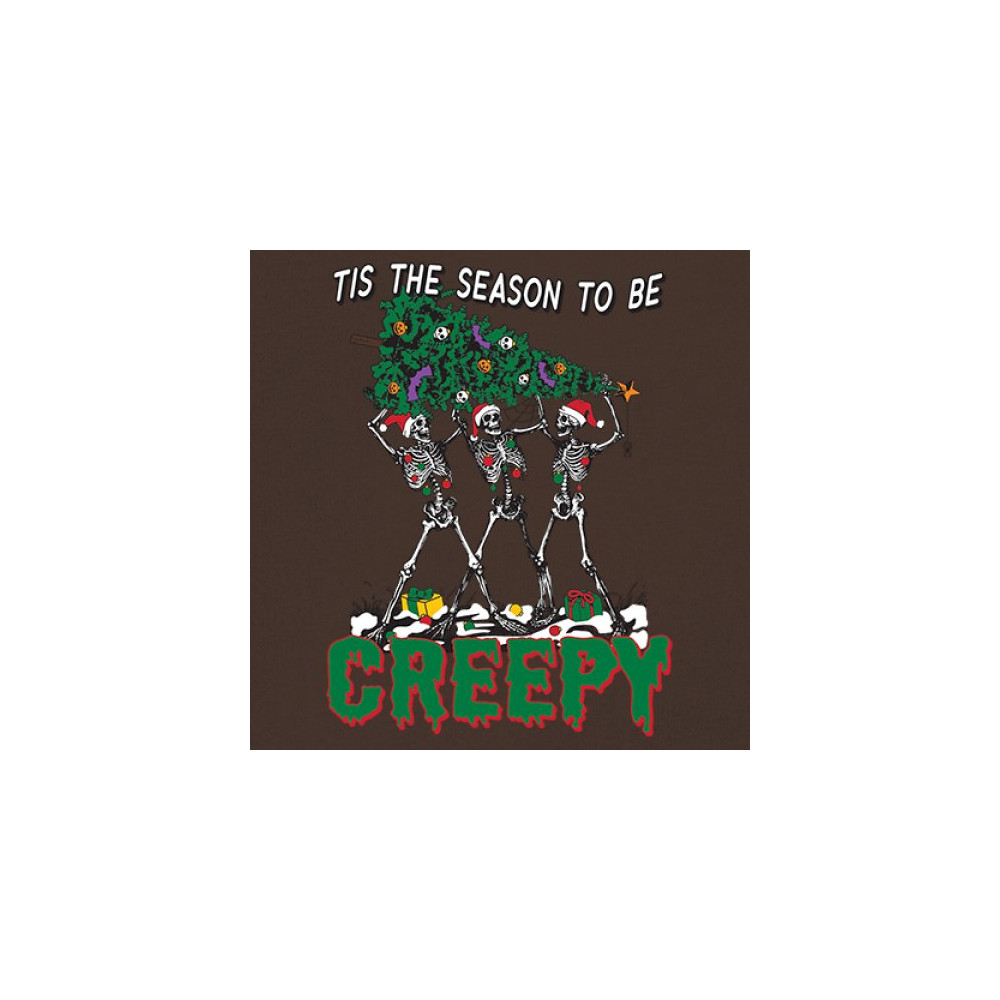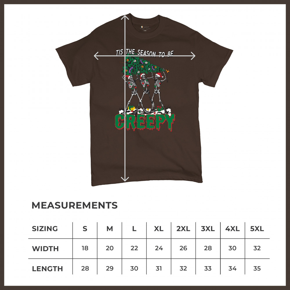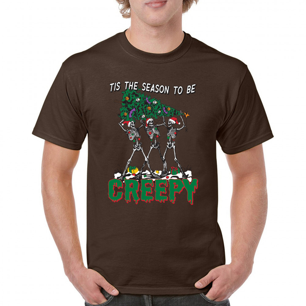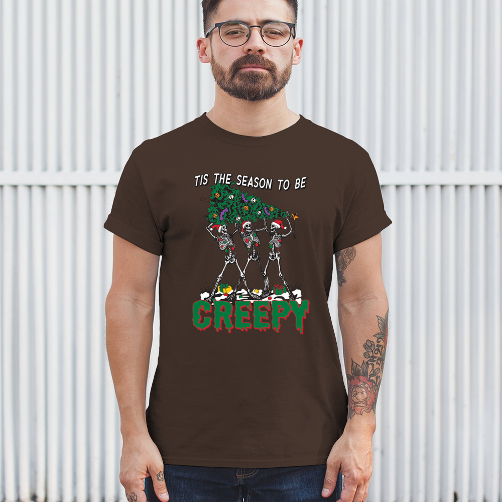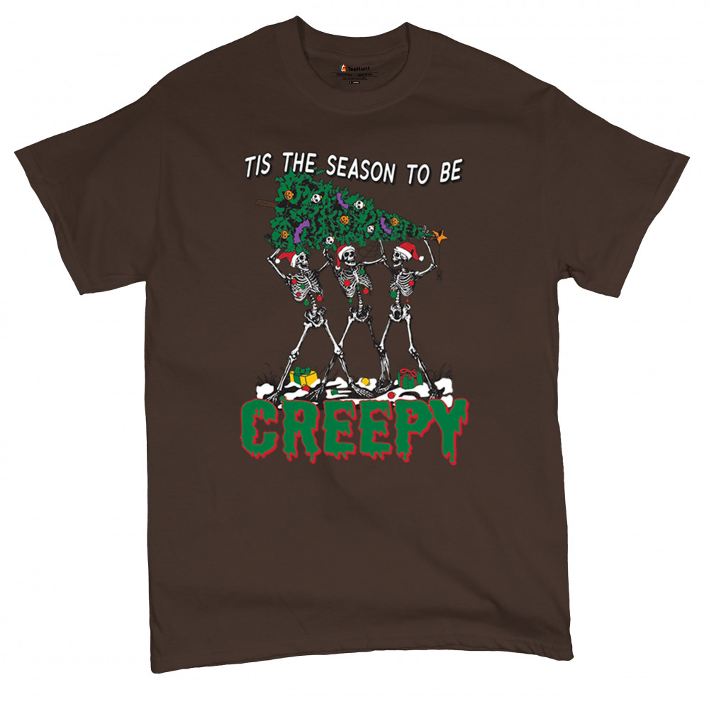 "Tis the Season to Be Creepy" combines holiday cheer with a hauntingly fun twist. This creative design features skeletons donning Santa hats as they carry a spooky Christmas tree decorated with eerie ornaments. Perfect for holiday gatherings, Secret Santa gifts, or themed parties, this design celebrates the festive and the macabre. Embrace the jolliest and creepiest bunch this season with this standout apparel.