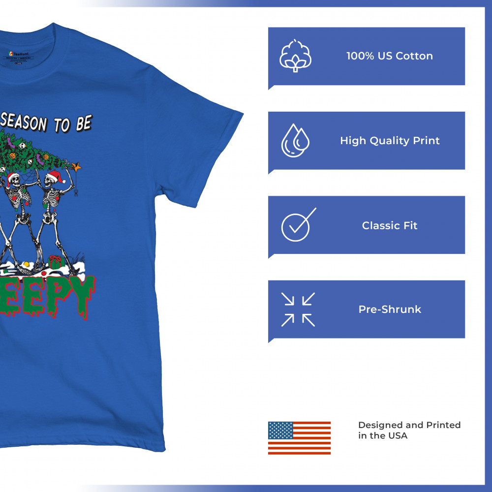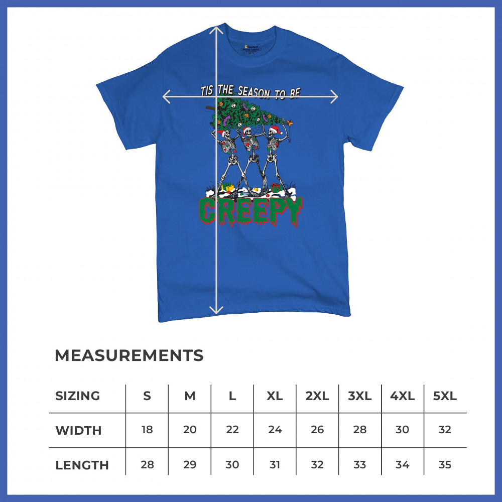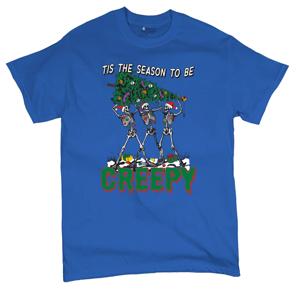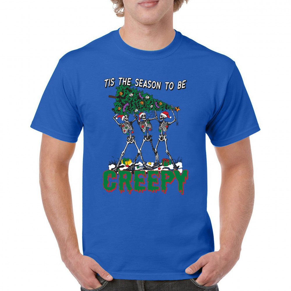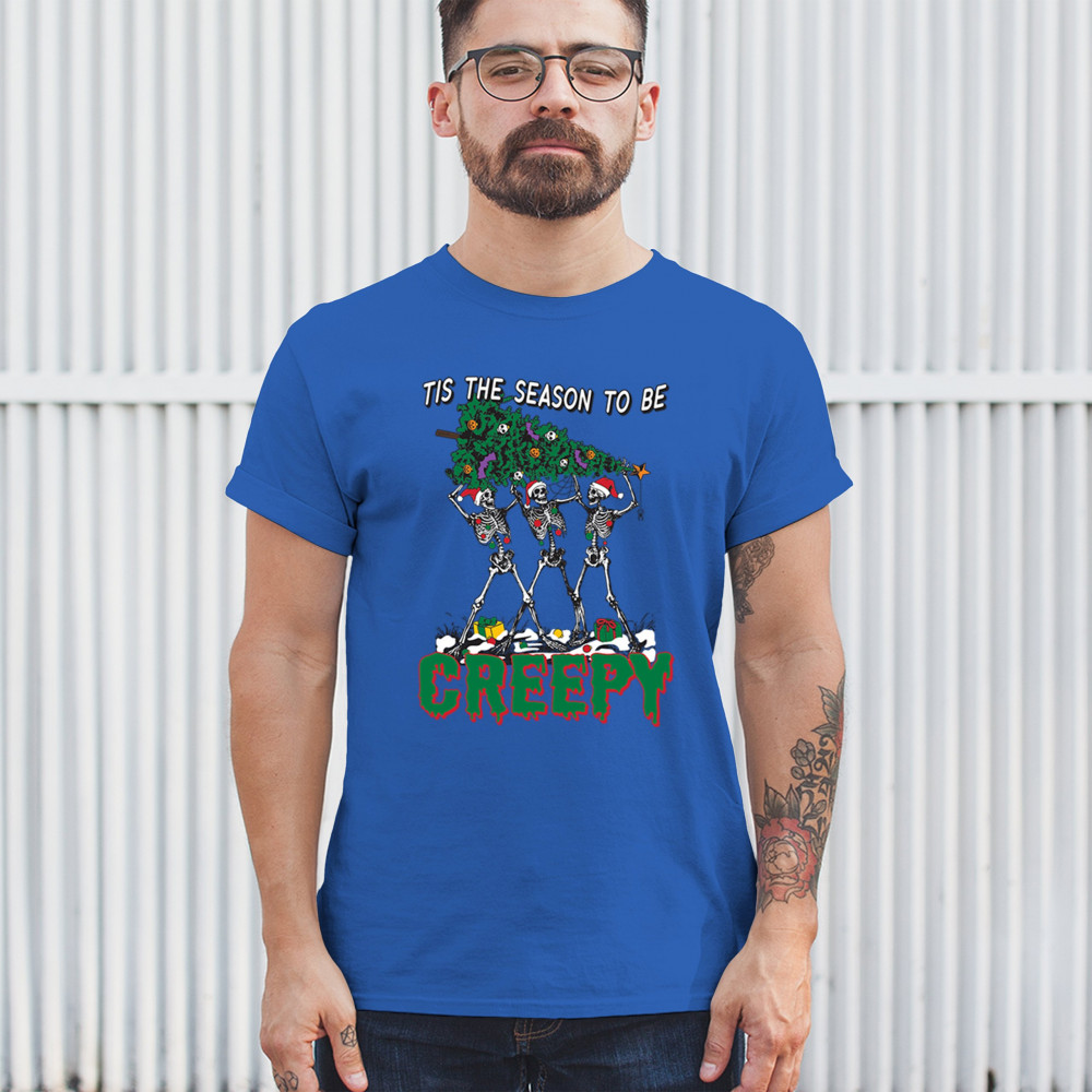"Tis the Season to Be Creepy" combines holiday cheer with a hauntingly fun twist. This creative design features skeletons donning Santa hats as they carry a spooky Christmas tree decorated with eerie ornaments. Perfect for holiday gatherings, Secret Santa gifts, or themed parties, this design celebrates the festive and the macabre. Embrace the jolliest and creepiest bunch this season with this standout apparel.