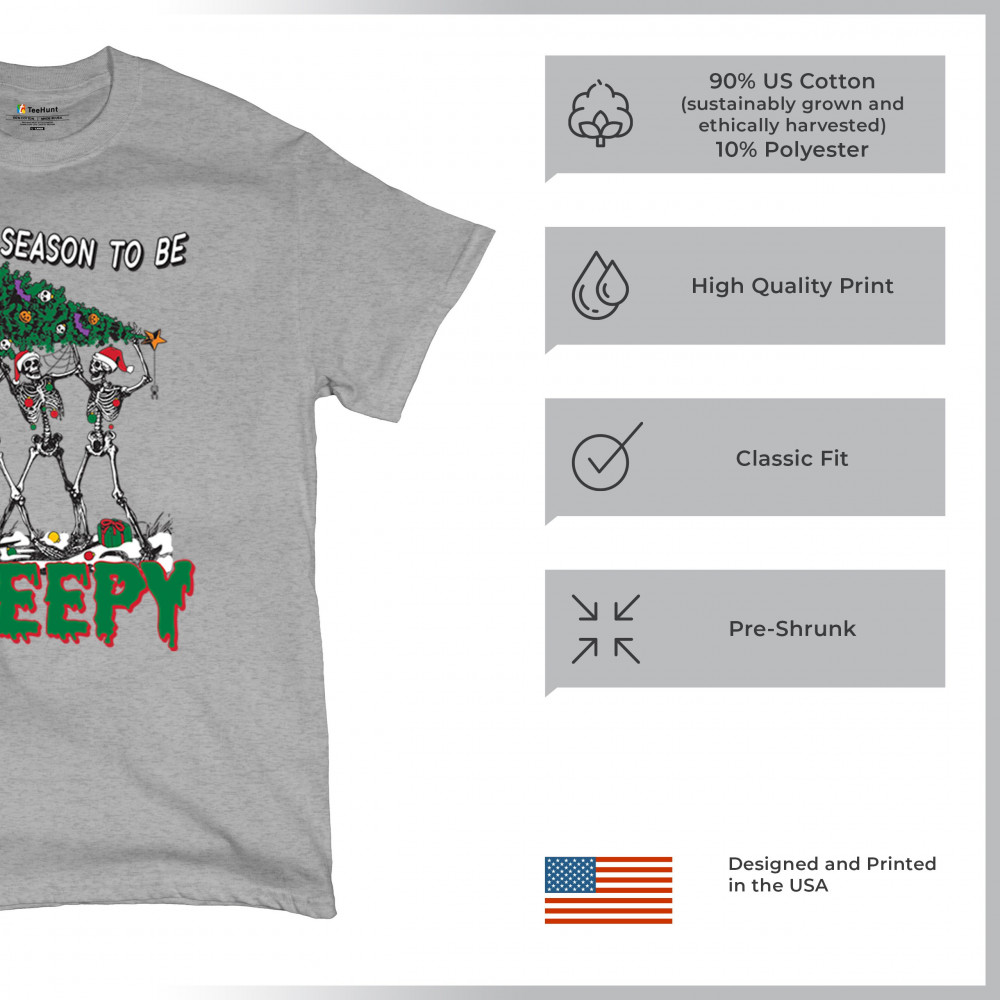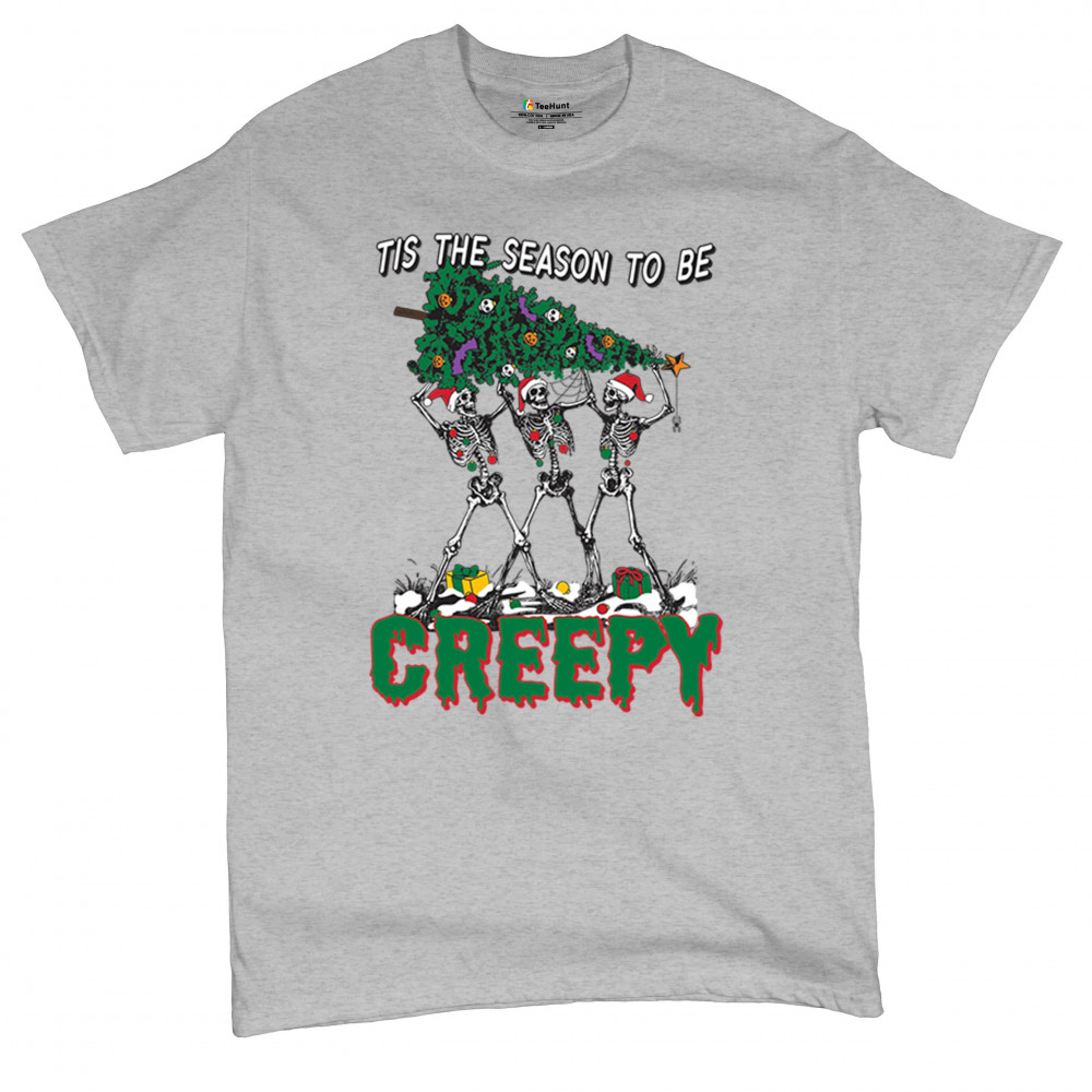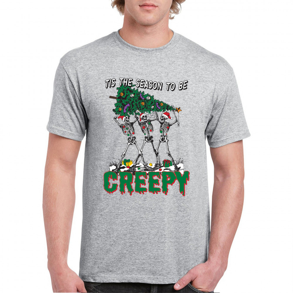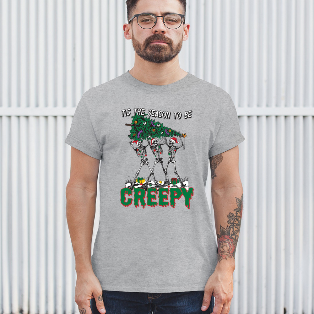 "Tis the Season to Be Creepy" combines holiday cheer with a hauntingly fun twist. This creative design features skeletons donning Santa hats as they carry a spooky Christmas tree decorated with eerie ornaments. Perfect for holiday gatherings, Secret Santa gifts, or themed parties, this design celebrates the festive and the macabre. Embrace the jolliest and creepiest bunch this season with this standout apparel.