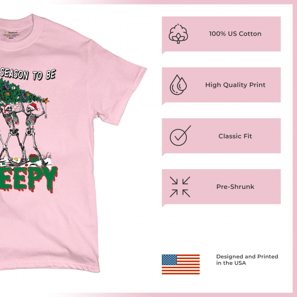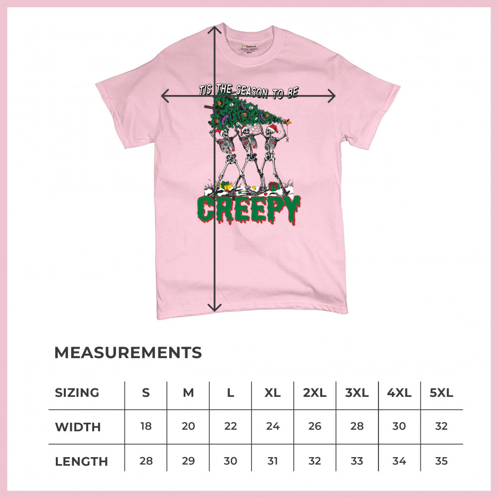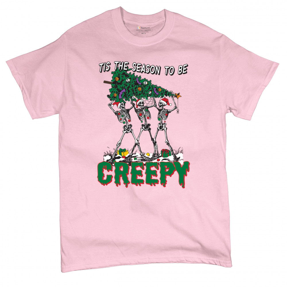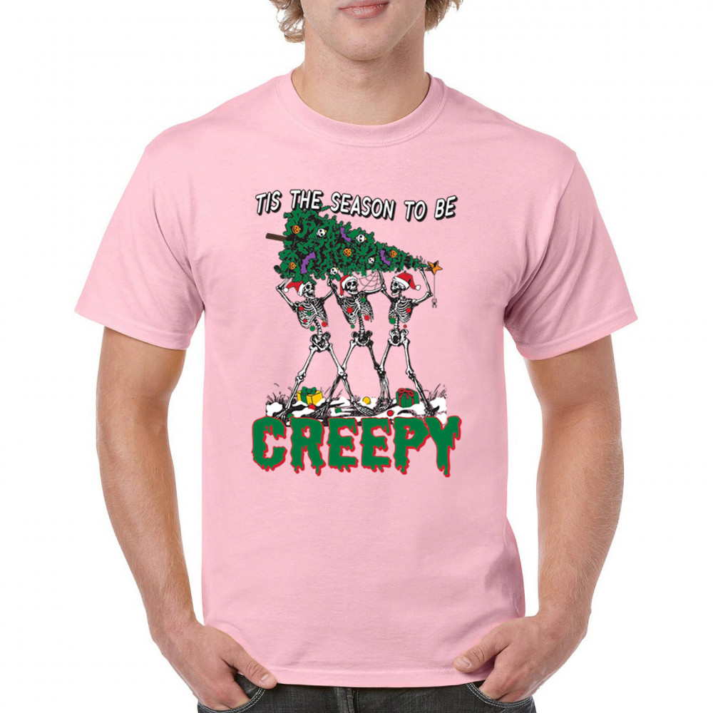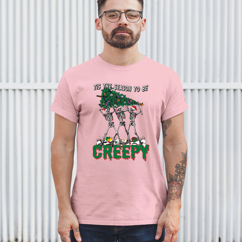 "Tis the Season to Be Creepy" combines holiday cheer with a hauntingly fun twist. This creative design features skeletons donning Santa hats as they carry a spooky Christmas tree decorated with eerie ornaments. Perfect for holiday gatherings, Secret Santa gifts, or themed parties, this design celebrates the festive and the macabre. Embrace the jolliest and creepiest bunch this season with this standout apparel.