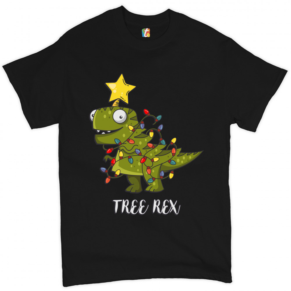 A print saying: "tree rex". The print features an adorable Tyrannosaurus Rex tangled in Christmas lights and having a star topper on it's head. Amazing choice to make people smile and spread positive vibes on Christmas Eve.