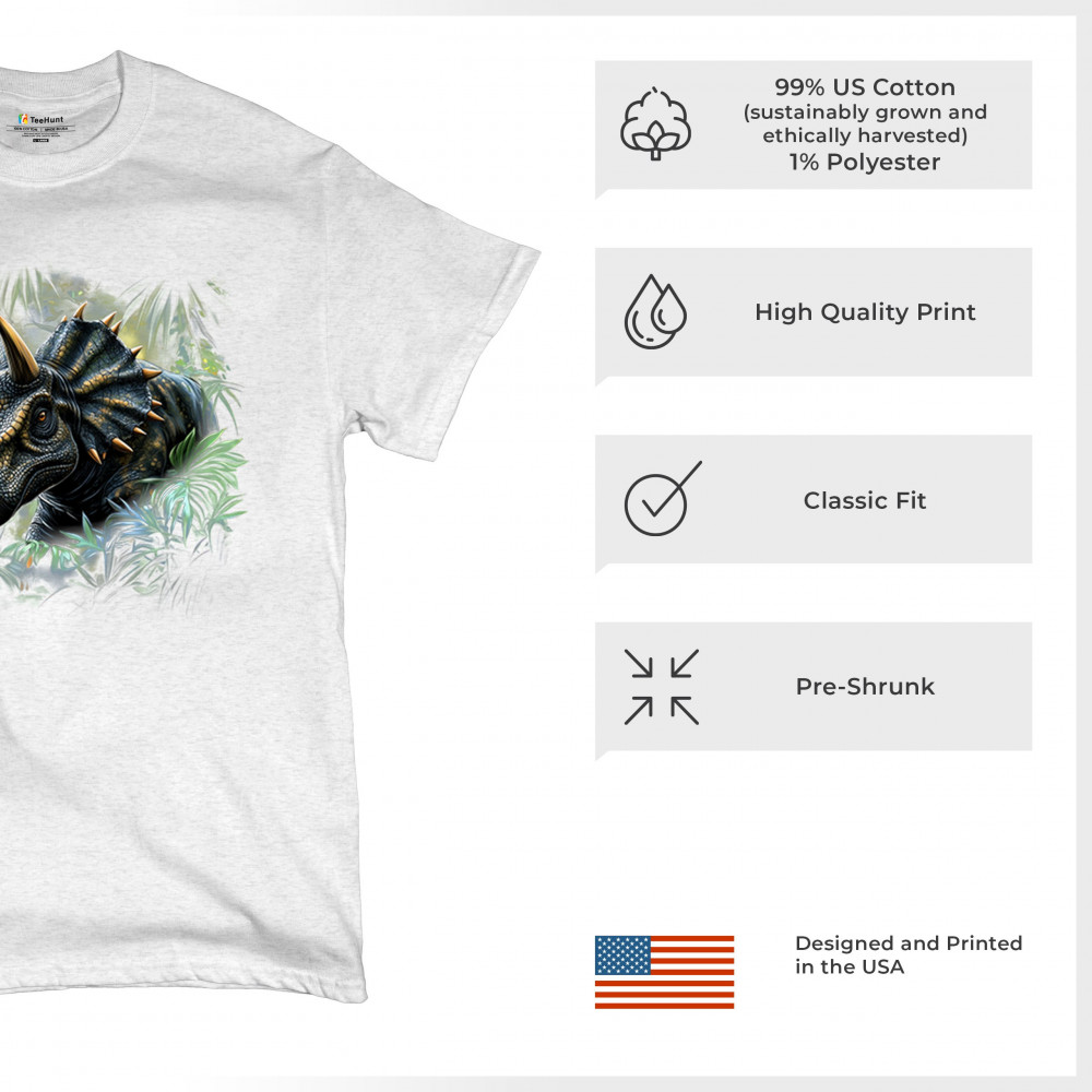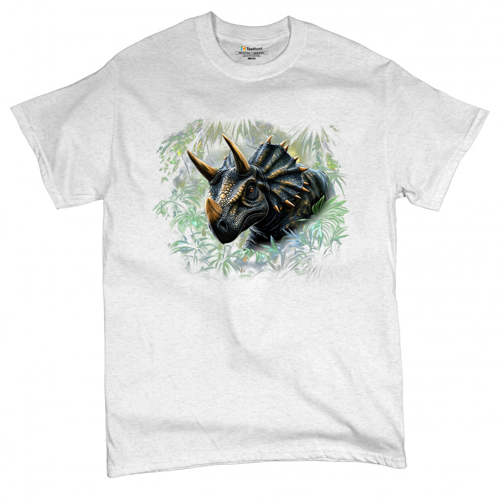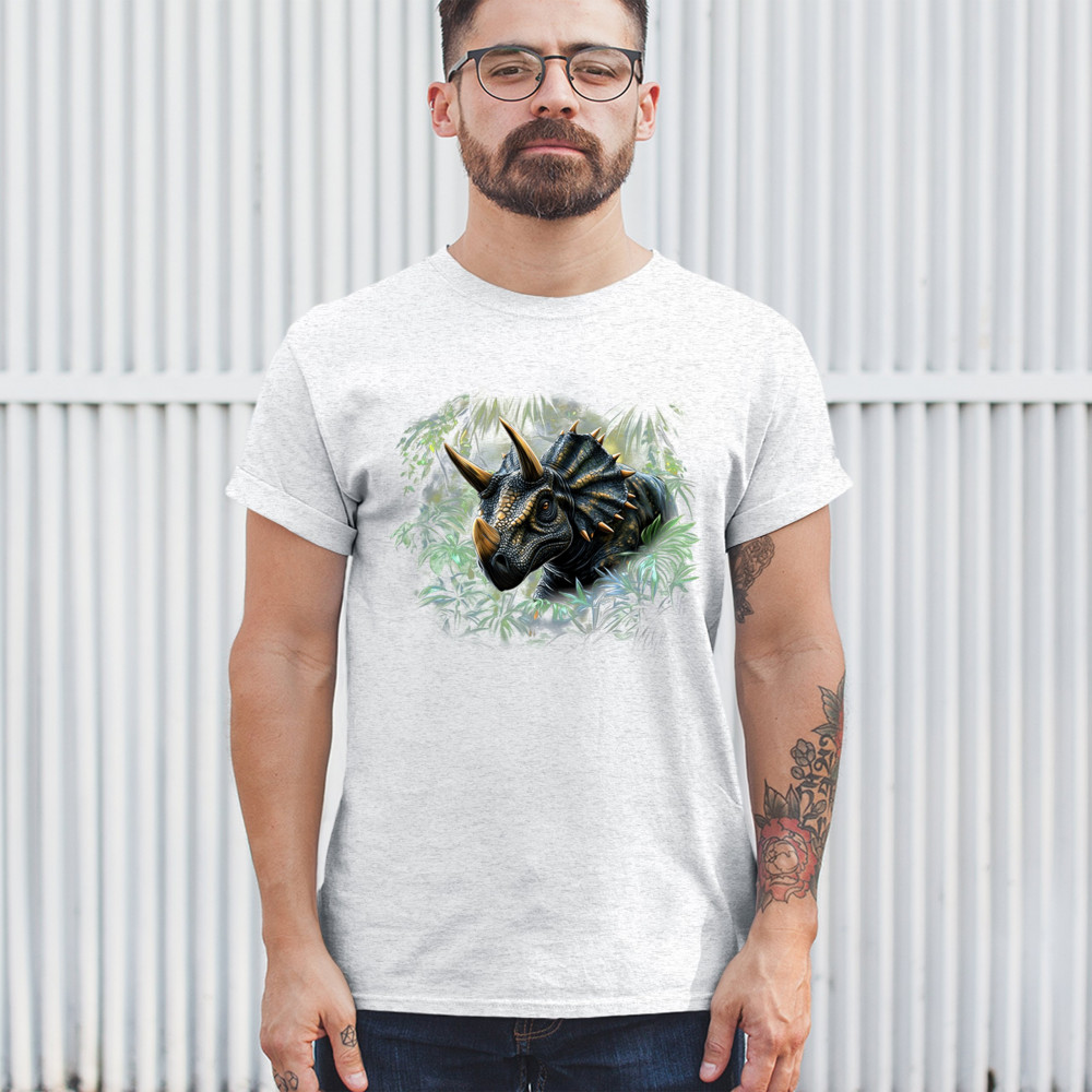 Charge into the past with this vivid triceratops design. Featuring a hyper-detailed horned dinosaur surrounded by jungle leaves, this design is perfect for dino lovers, fossil enthusiasts, and anyone fascinated by prehistoric beasts. Great for Jurassic parties, safari parks, or museum visits, it brings ancient strength to life.