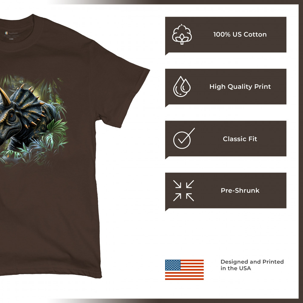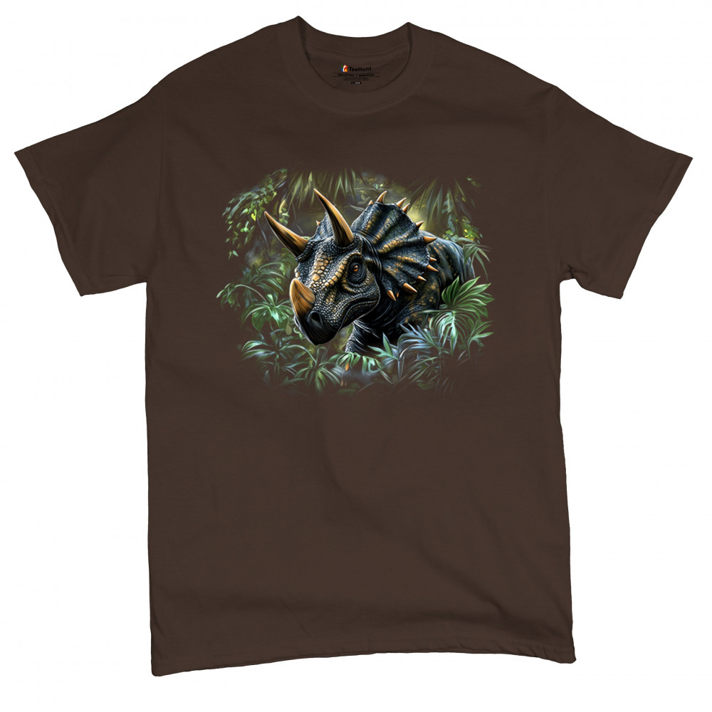 Charge into the past with this vivid triceratops design. Featuring a hyper-detailed horned dinosaur surrounded by jungle leaves, this design is perfect for dino lovers, fossil enthusiasts, and anyone fascinated by prehistoric beasts. Great for Jurassic parties, safari parks, or museum visits, it brings ancient strength to life.