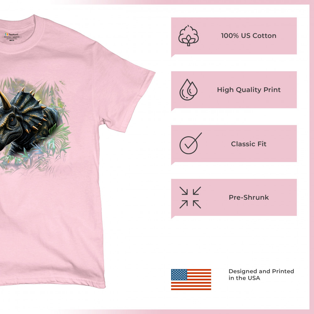 Charge into the past with this vivid triceratops design. Featuring a hyper-detailed horned dinosaur surrounded by jungle leaves, this design is perfect for dino lovers, fossil enthusiasts, and anyone fascinated by prehistoric beasts. Great for Jurassic parties, safari parks, or museum visits, it brings ancient strength to life.