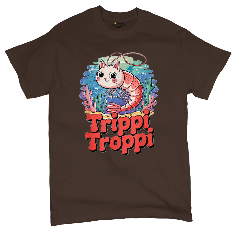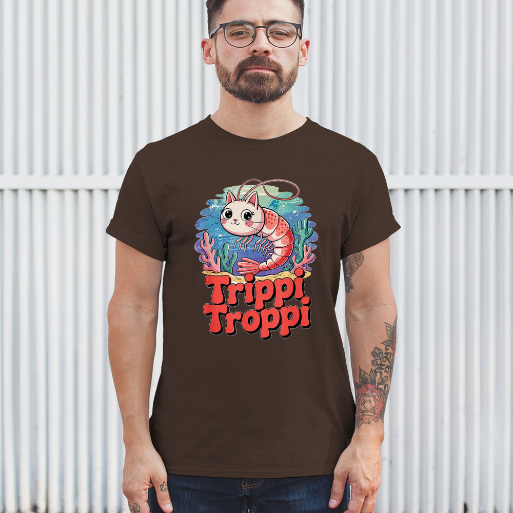 Dive deep into absurdity with Trippi Troppi—a surreal shrimp-cat fusion straight out of Italian Brainrot territory. This design captures cursed animal chaos, weirdcore visuals, TikTok meme culture, and underwater fever dream aesthetics. Made for Gen Z humor addicts, ocean meme fans, and ironic fashion lovers alike.