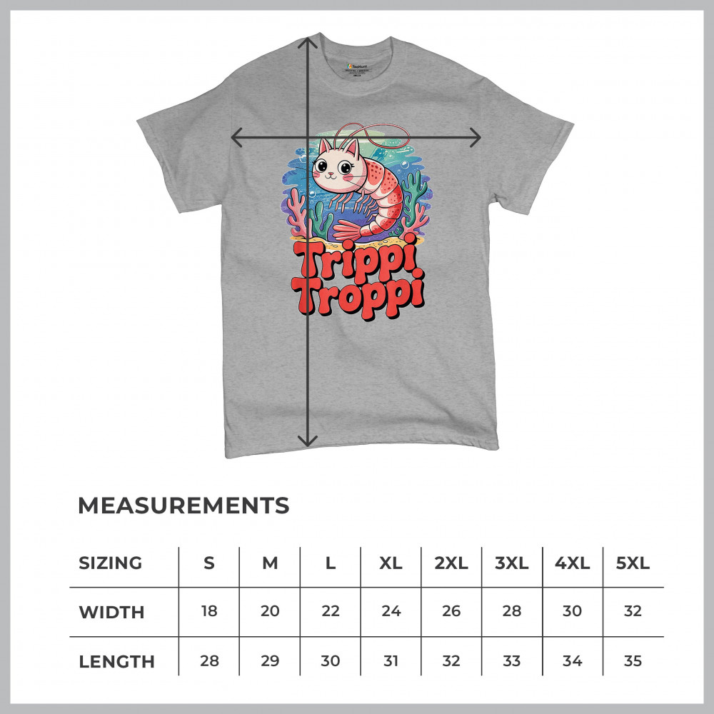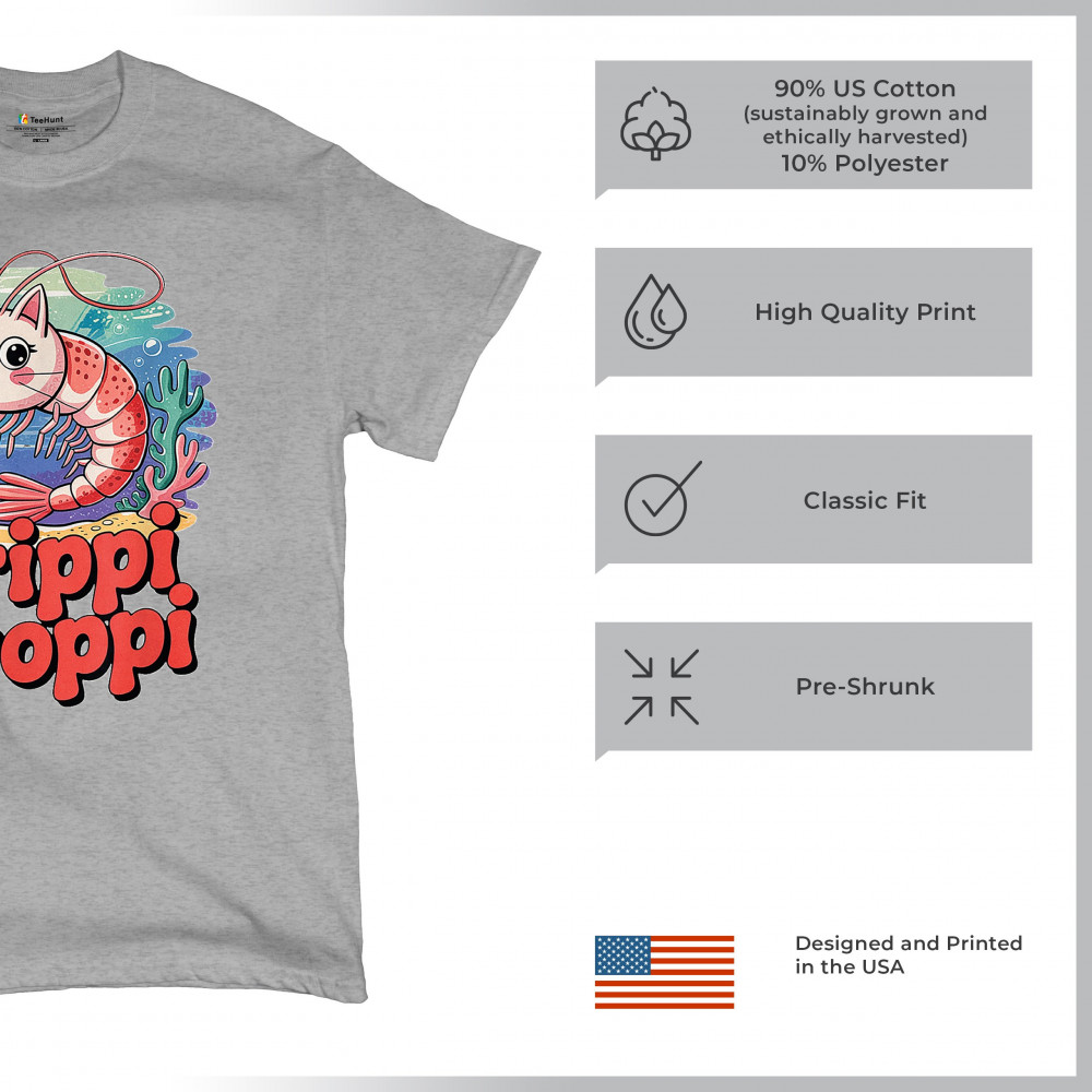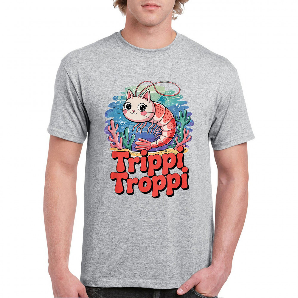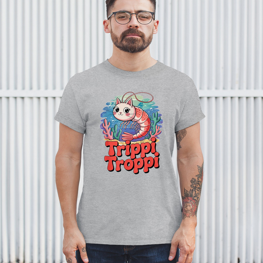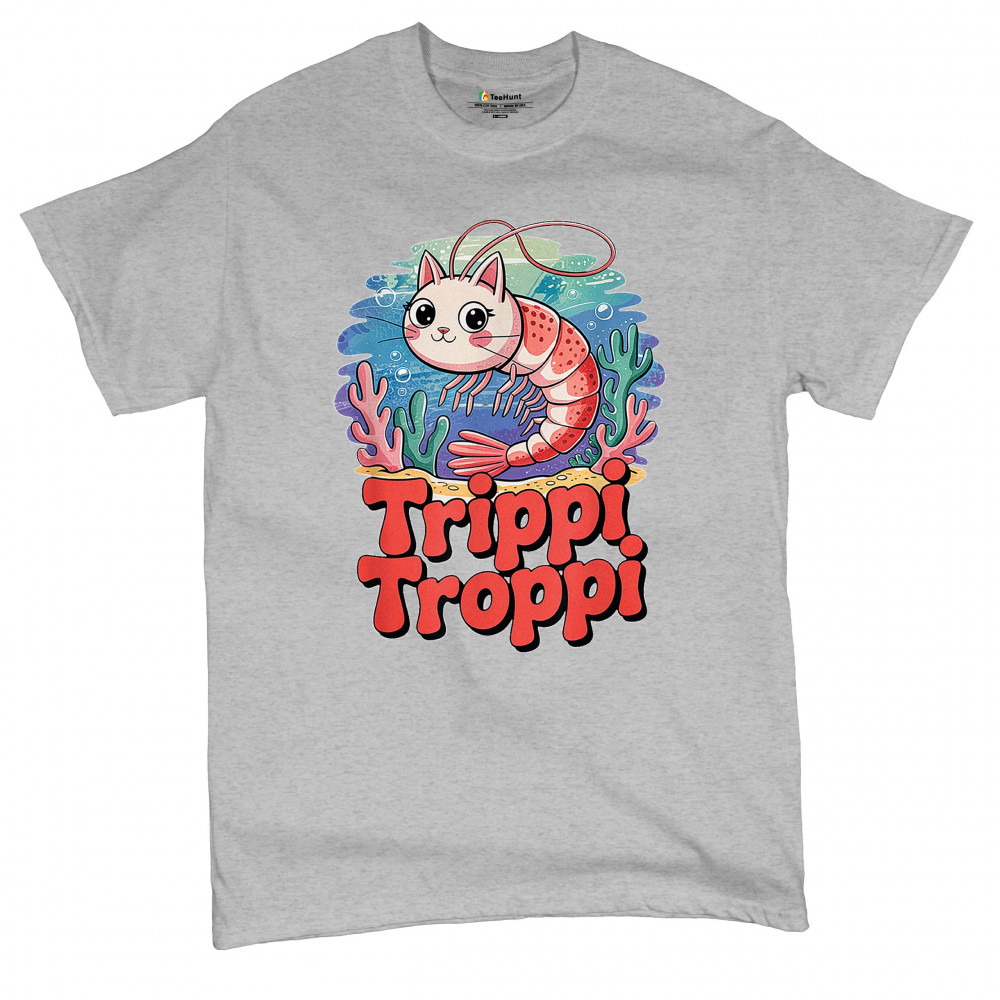 Dive deep into absurdity with Trippi Troppi—a surreal shrimp-cat fusion straight out of Italian Brainrot territory. This design captures cursed animal chaos, weirdcore visuals, TikTok meme culture, and underwater fever dream aesthetics. Made for Gen Z humor addicts, ocean meme fans, and ironic fashion lovers alike.