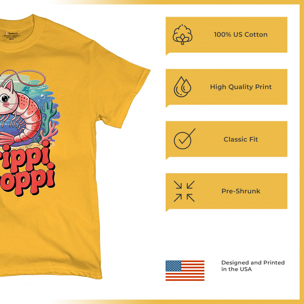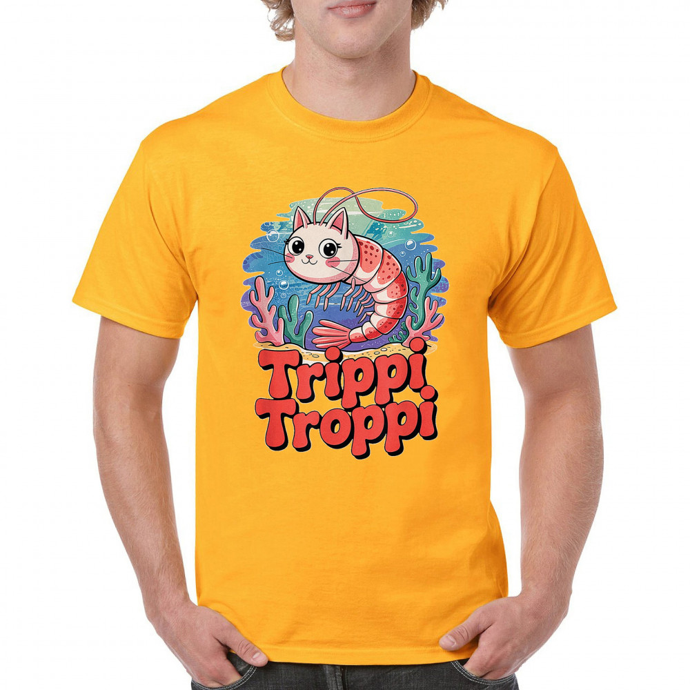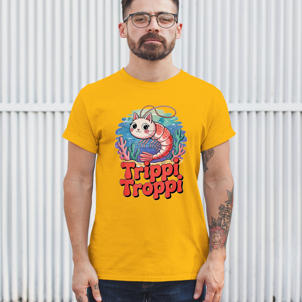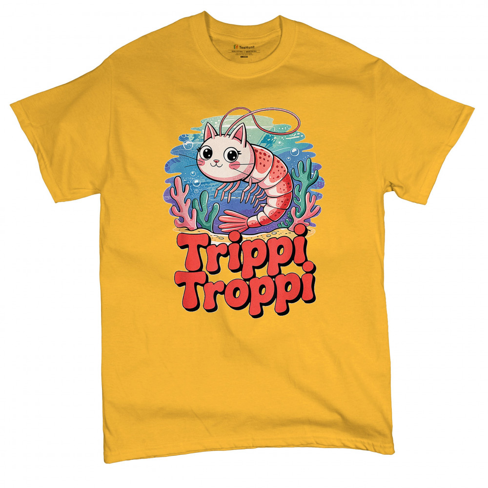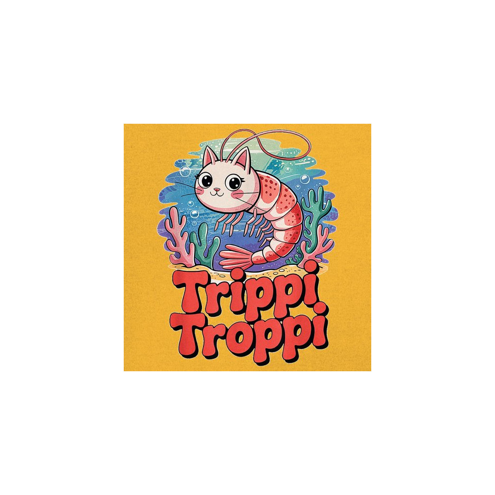 Dive deep into absurdity with Trippi Troppi—a surreal shrimp-cat fusion straight out of Italian Brainrot territory. This design captures cursed animal chaos, weirdcore visuals, TikTok meme culture, and underwater fever dream aesthetics. Made for Gen Z humor addicts, ocean meme fans, and ironic fashion lovers alike.