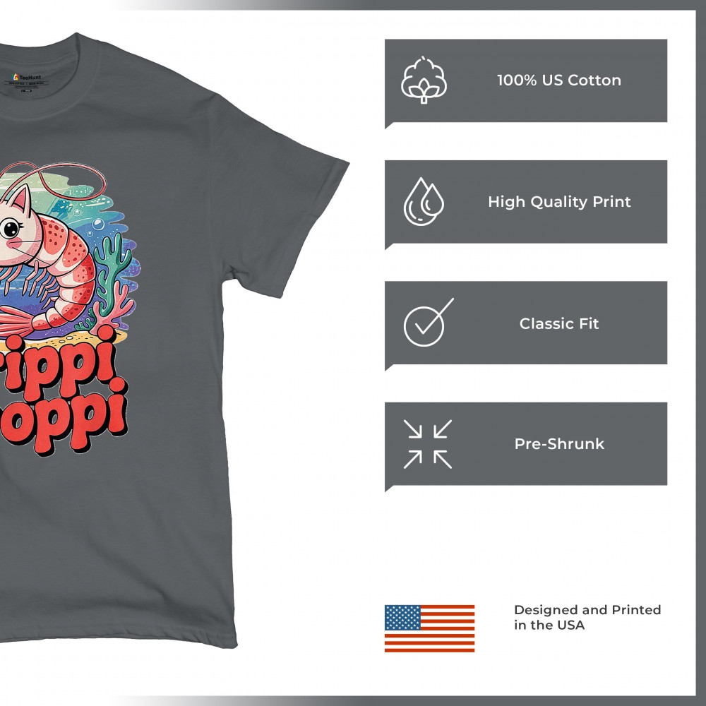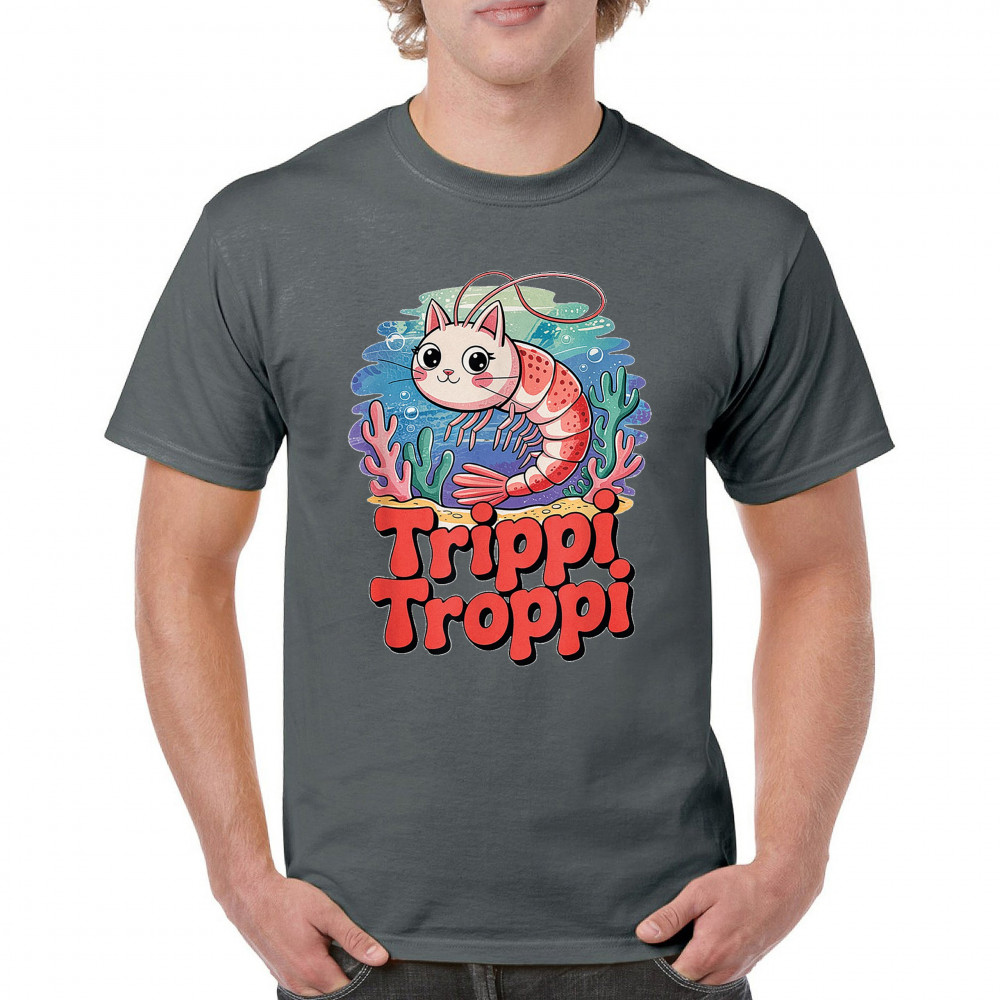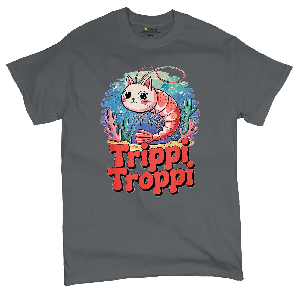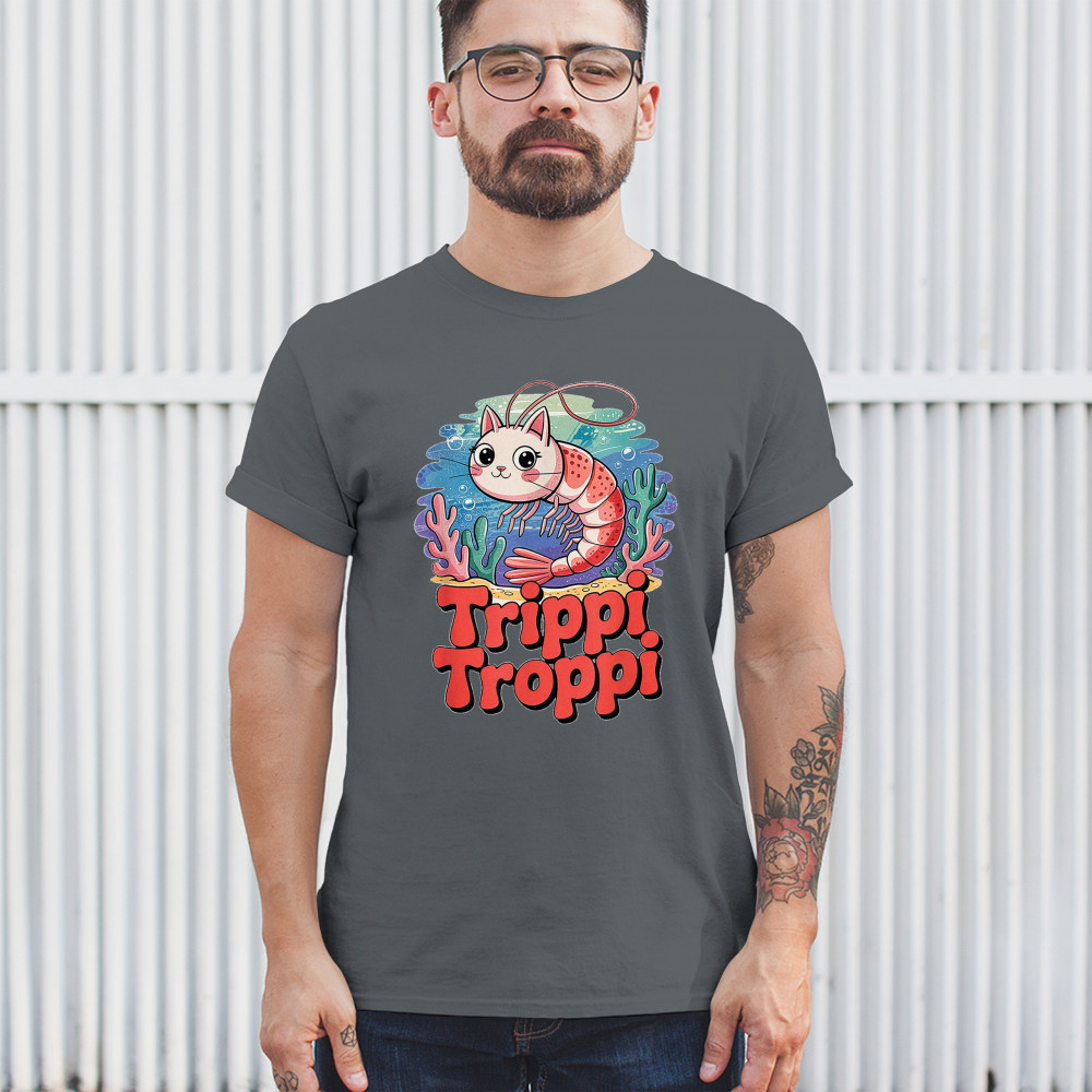 Dive deep into absurdity with Trippi Troppi—a surreal shrimp-cat fusion straight out of Italian Brainrot territory. This design captures cursed animal chaos, weirdcore visuals, TikTok meme culture, and underwater fever dream aesthetics. Made for Gen Z humor addicts, ocean meme fans, and ironic fashion lovers alike.