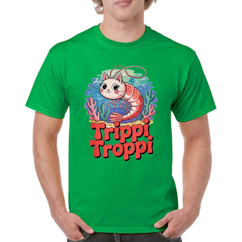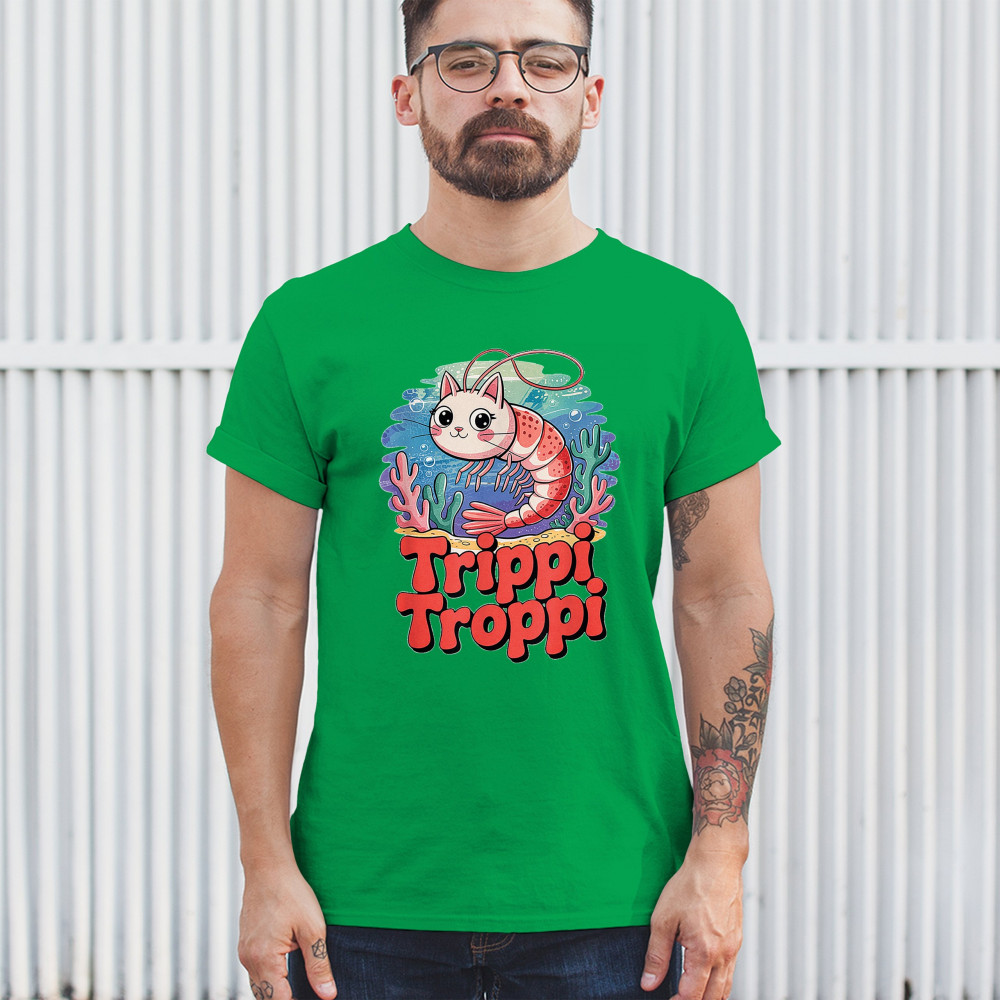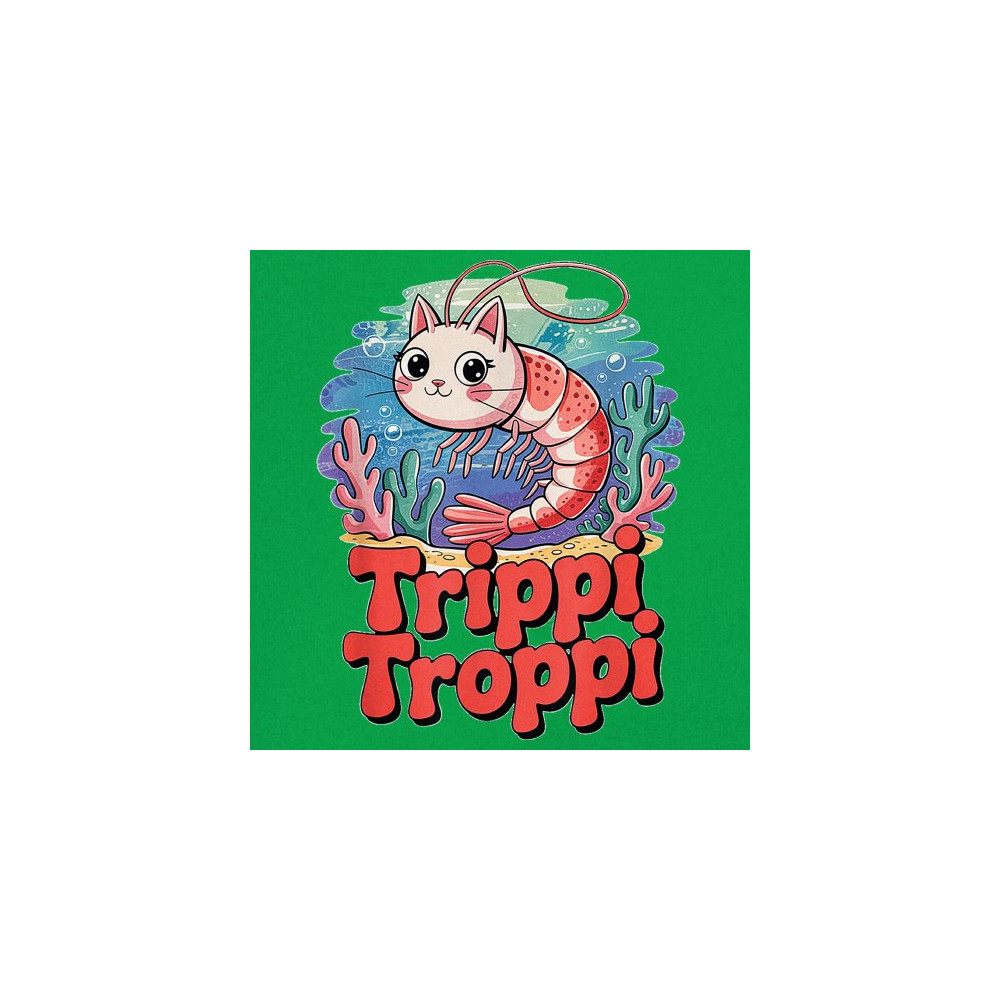 Dive deep into absurdity with Trippi Troppi—a surreal shrimp-cat fusion straight out of Italian Brainrot territory. This design captures cursed animal chaos, weirdcore visuals, TikTok meme culture, and underwater fever dream aesthetics. Made for Gen Z humor addicts, ocean meme fans, and ironic fashion lovers alike.