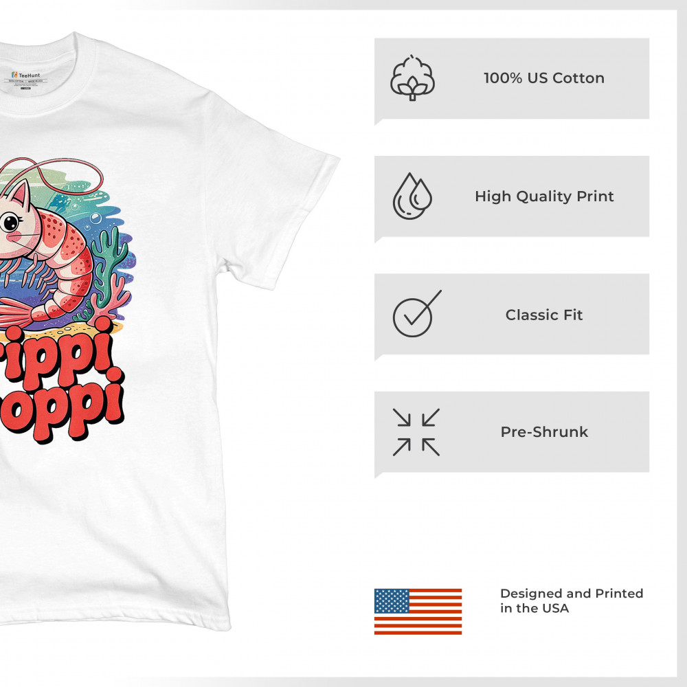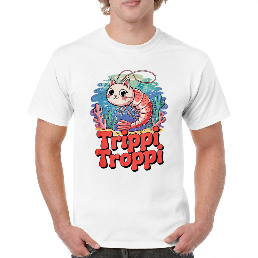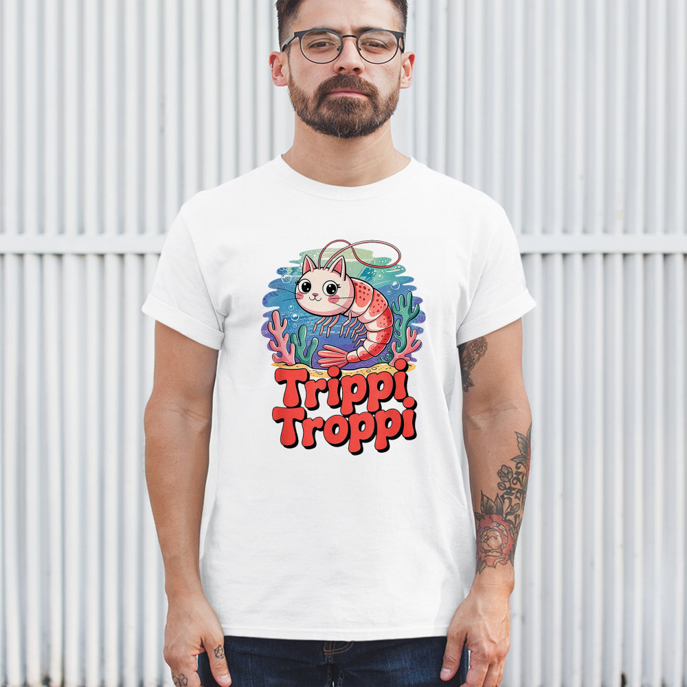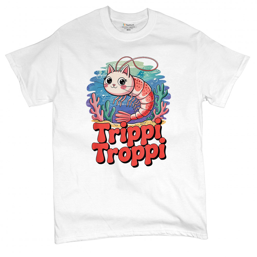 Dive deep into absurdity with Trippi Troppi—a surreal shrimp-cat fusion straight out of Italian Brainrot territory. This design captures cursed animal chaos, weirdcore visuals, TikTok meme culture, and underwater fever dream aesthetics. Made for Gen Z humor addicts, ocean meme fans, and ironic fashion lovers alike.