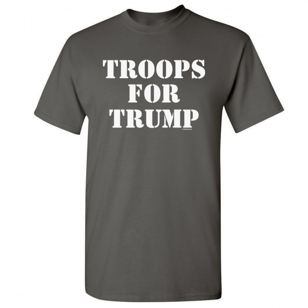 A political print saying "troops for Trump". A great choice to wear for a Trump rally or give as a gift to a Donald Trump and Mike Pence supporter before 2020 presidential elections.