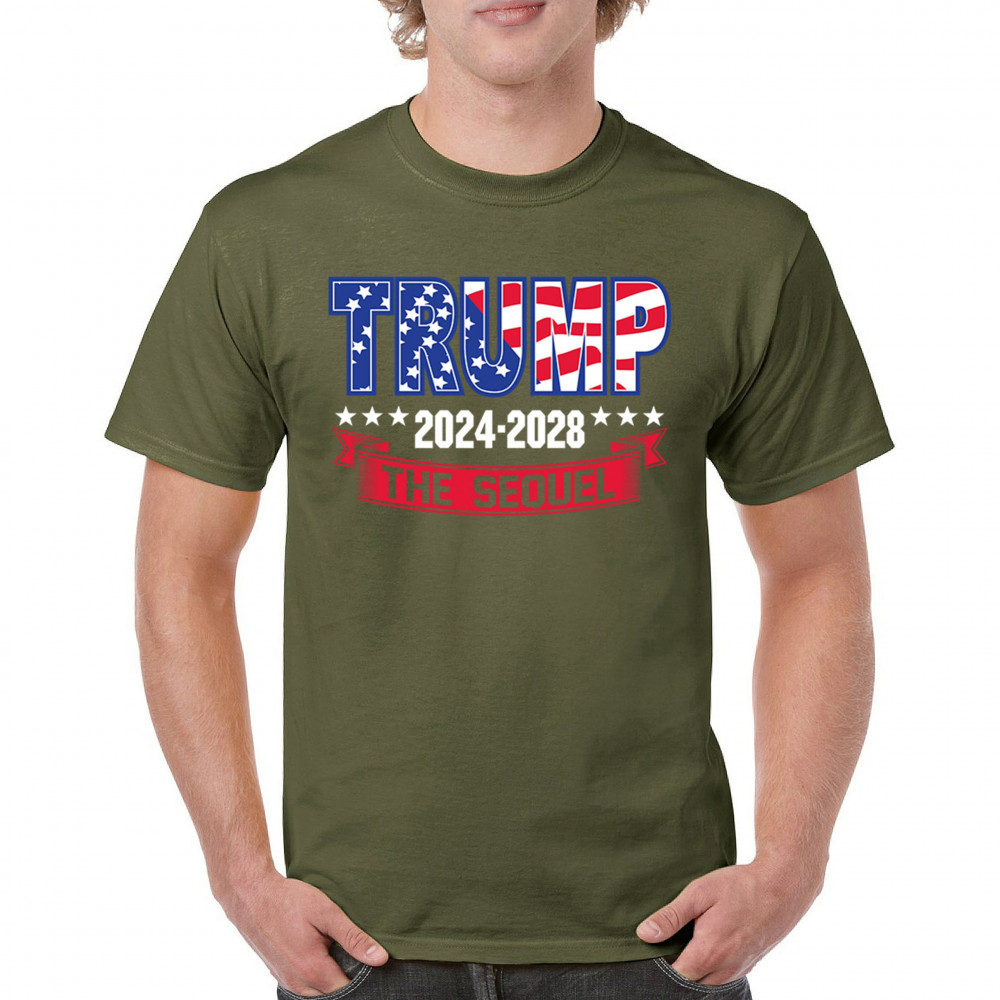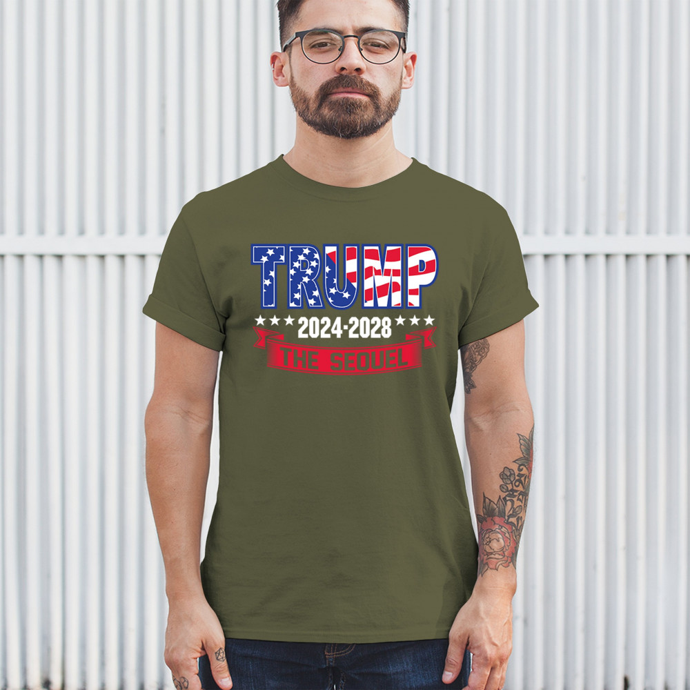 Stand with Trump for 2024-2028 in "The Sequel" design, celebrating America First, conservative values, and 4 more years of patriotic vision.
