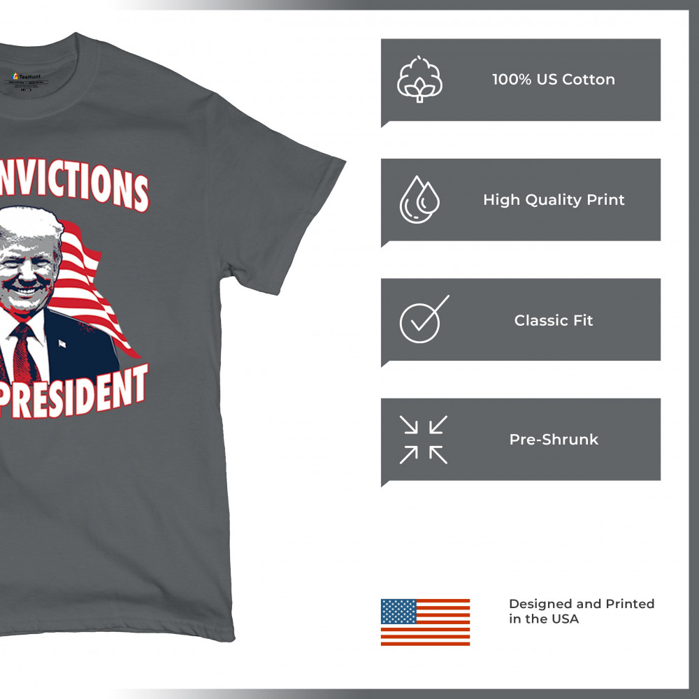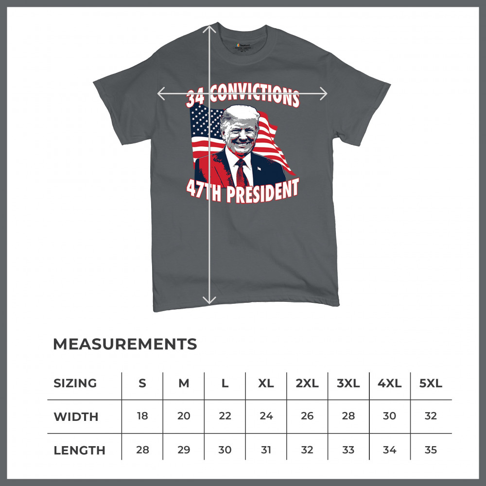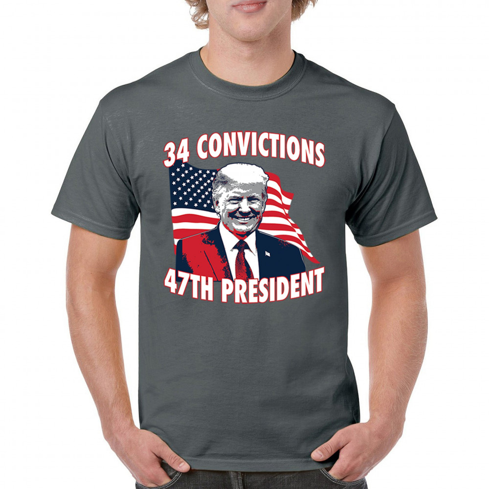 Show your support for Trump's 2024 campaign with the "34 Convictions, 47th President" design. Perfect for rallies, patriotic events, and conservative gatherings.