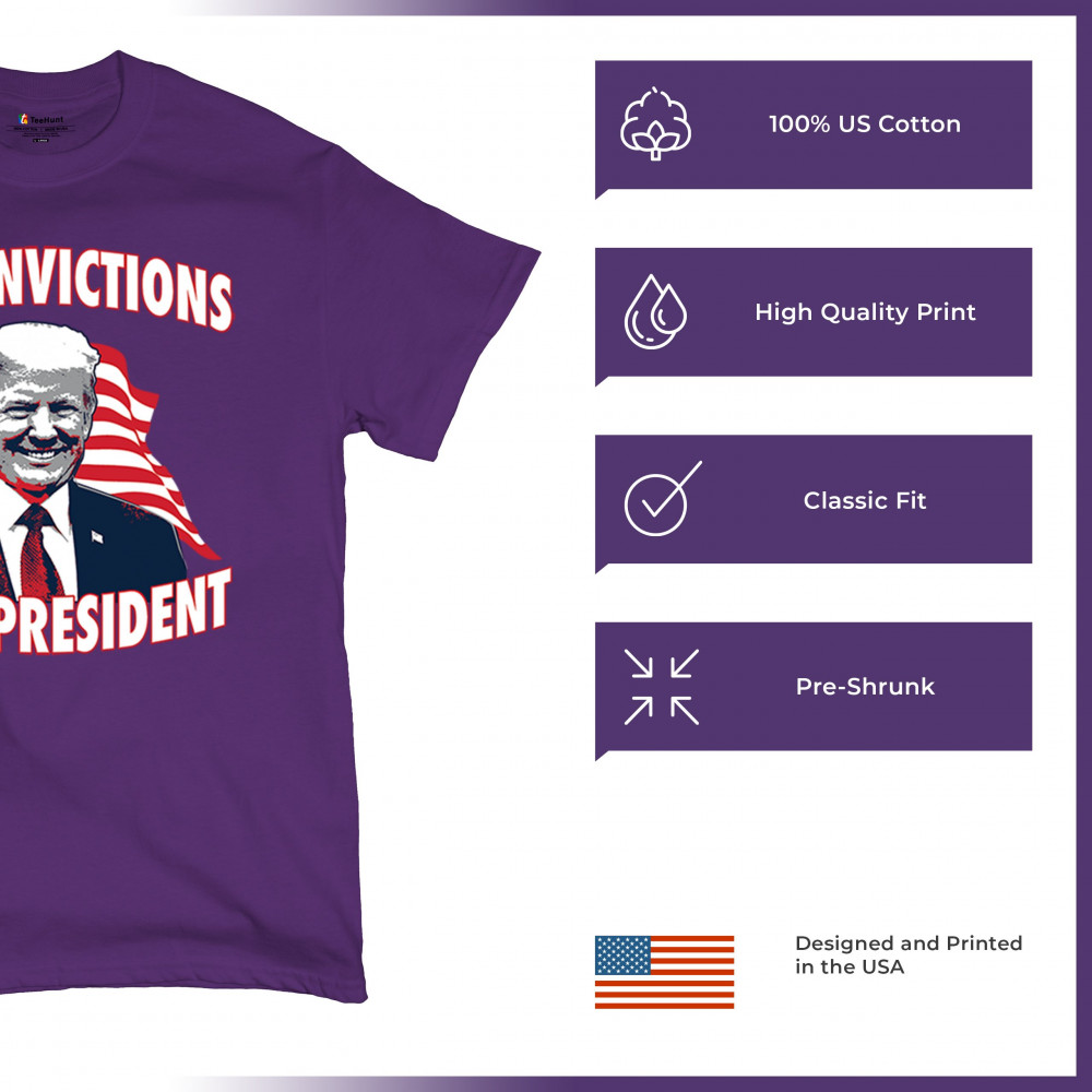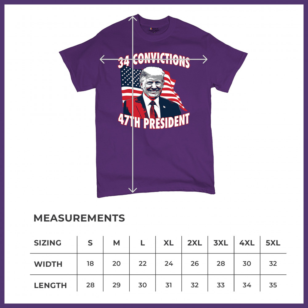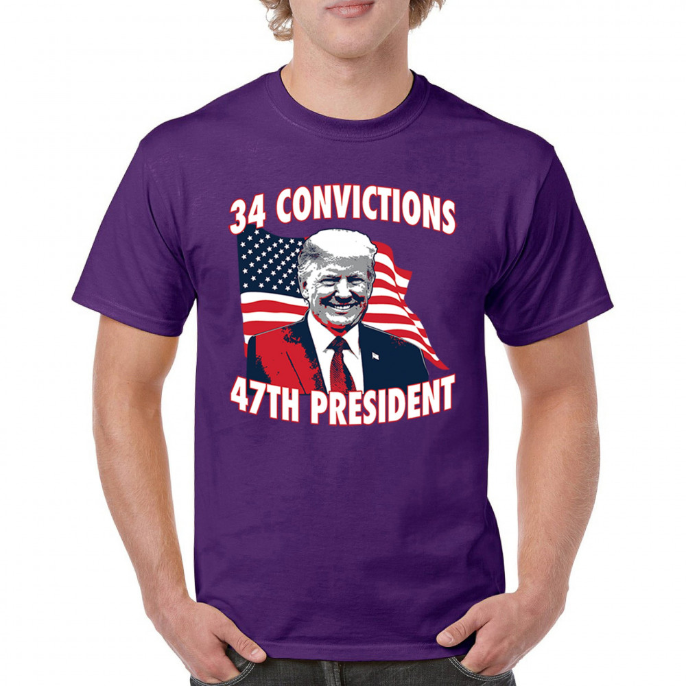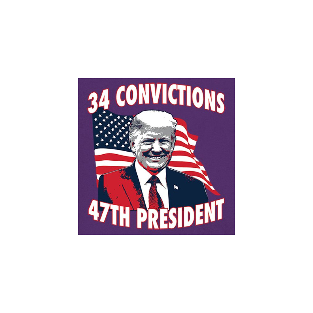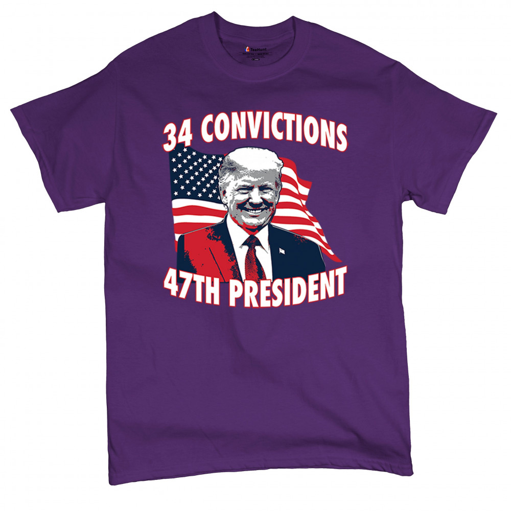 Show your support for Trump's 2024 campaign with the "34 Convictions, 47th President" design. Perfect for rallies, patriotic events, and conservative gatherings.