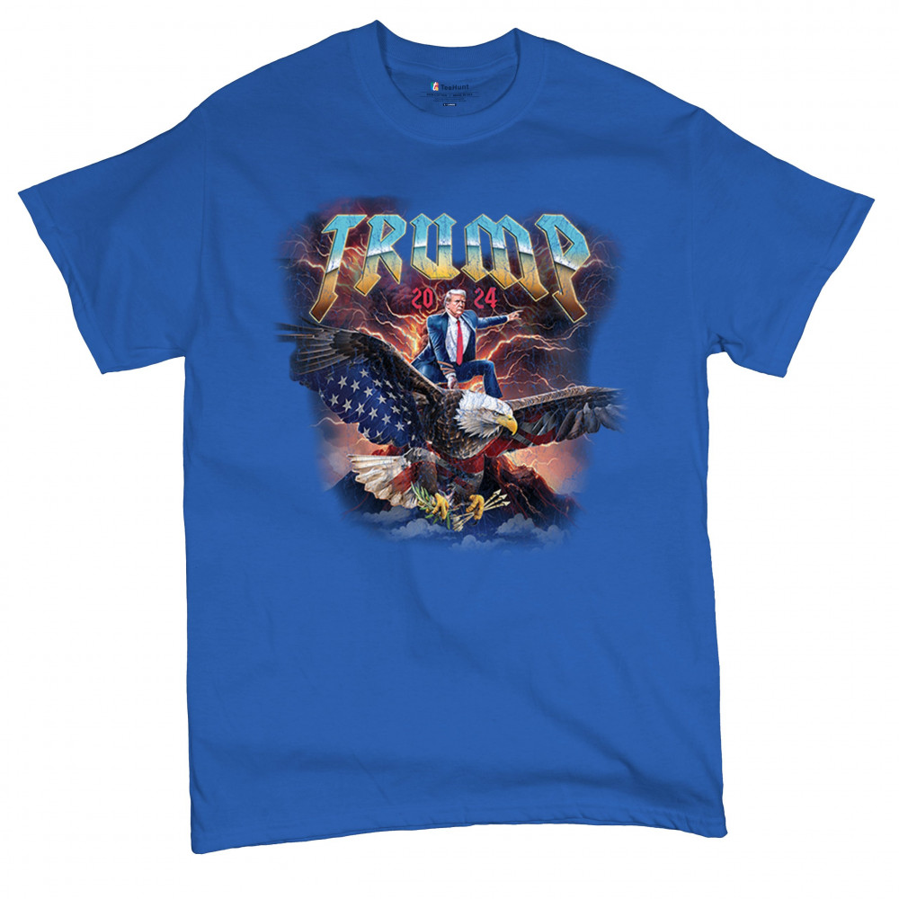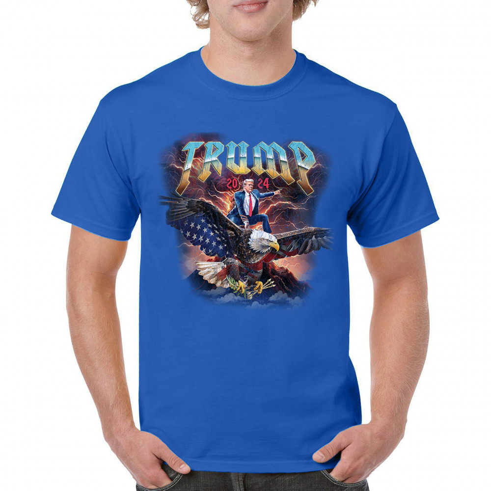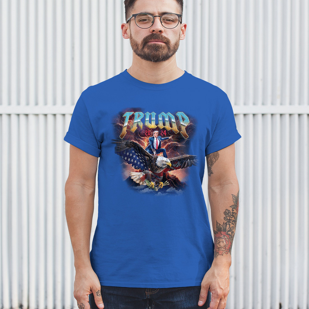 Stand out with our "Trump 2024" design featuring Trump riding an eagle. Perfect for rallies and patriotic events. Show your support with pride and confidence.