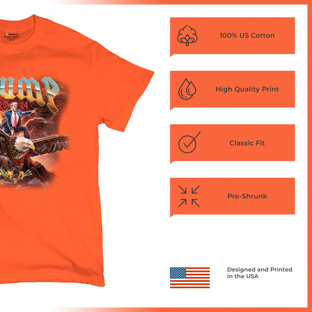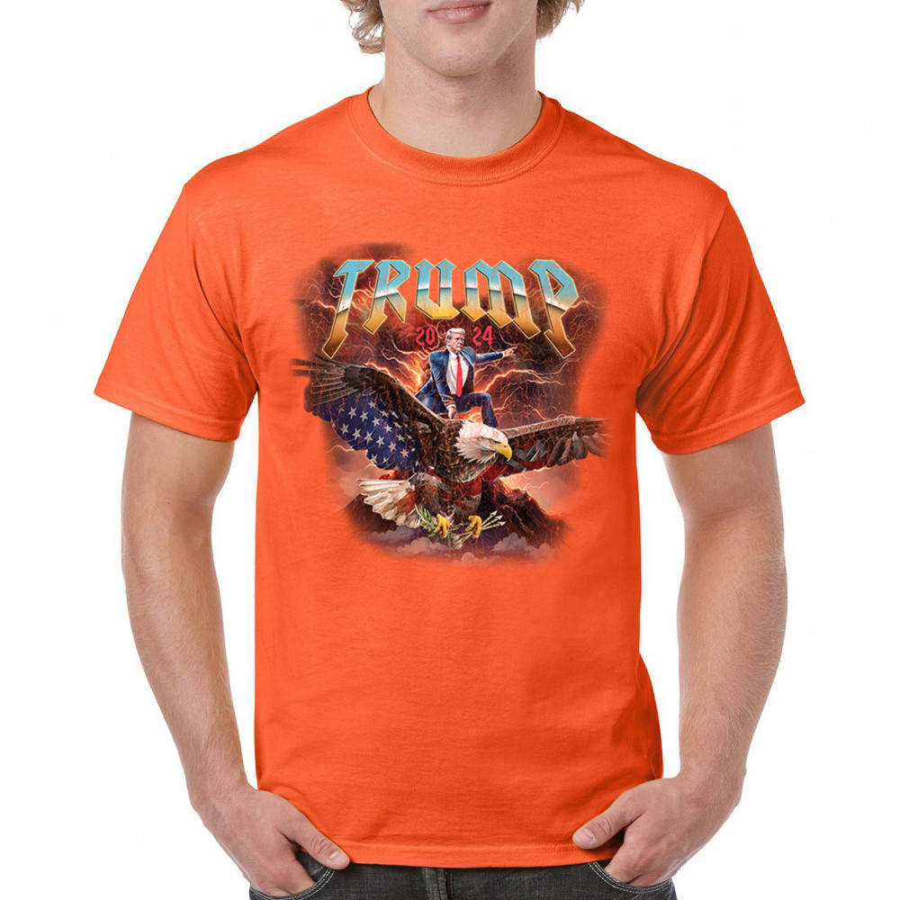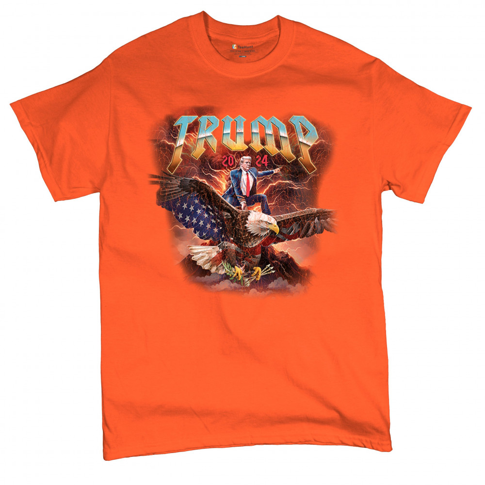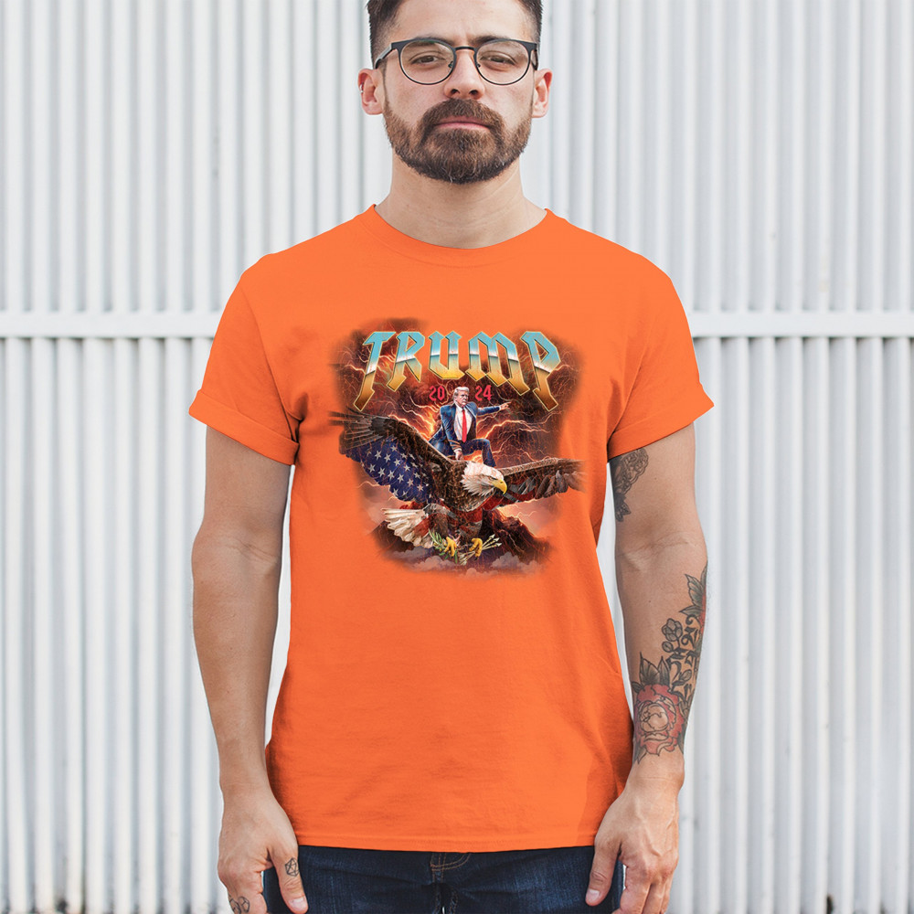 Stand out with our "Trump 2024" design featuring Trump riding an eagle. Perfect for rallies and patriotic events. Show your support with pride and confidence.