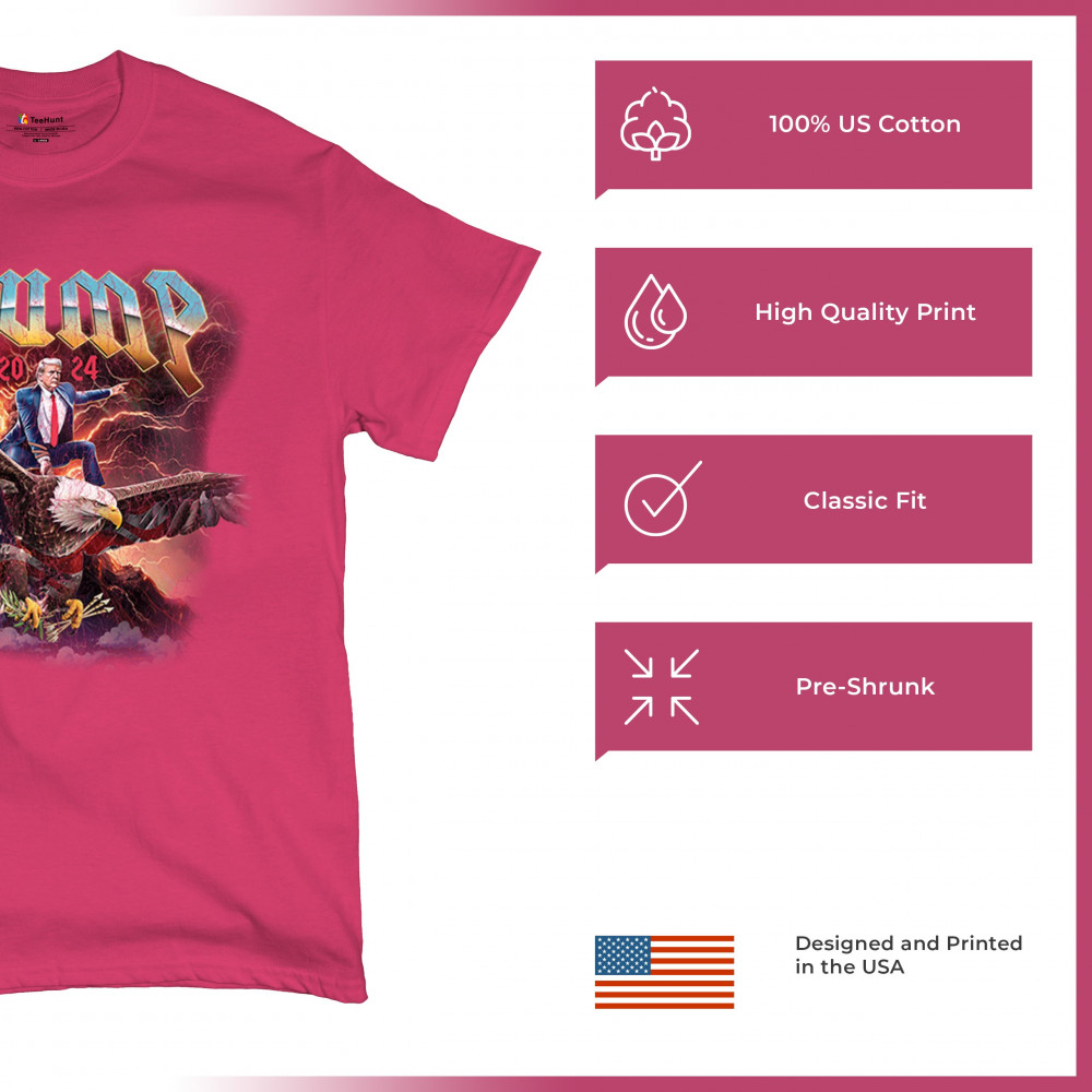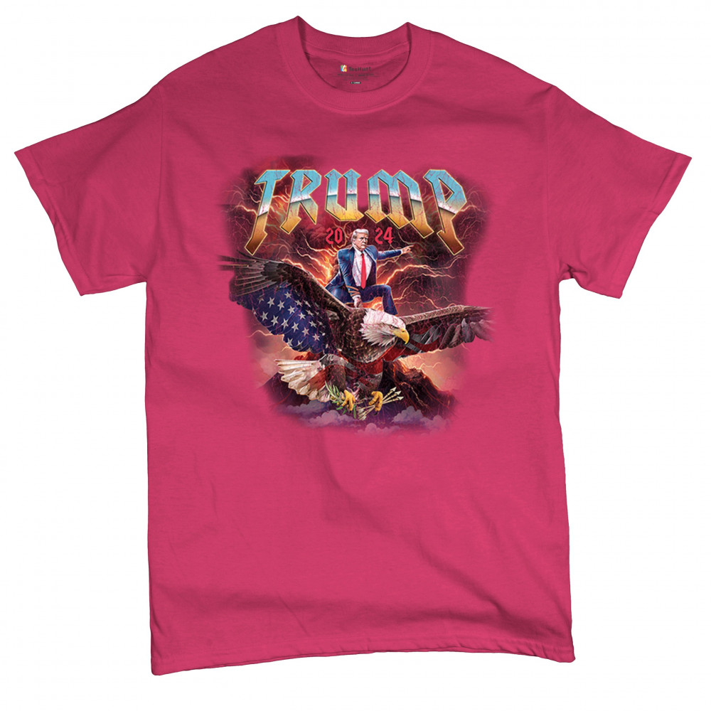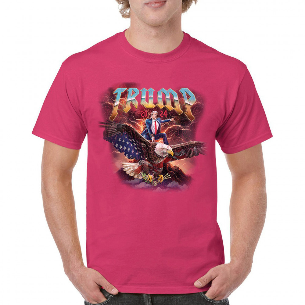 Stand out with our "Trump 2024" design featuring Trump riding an eagle. Perfect for rallies and patriotic events. Show your support with pride and confidence.