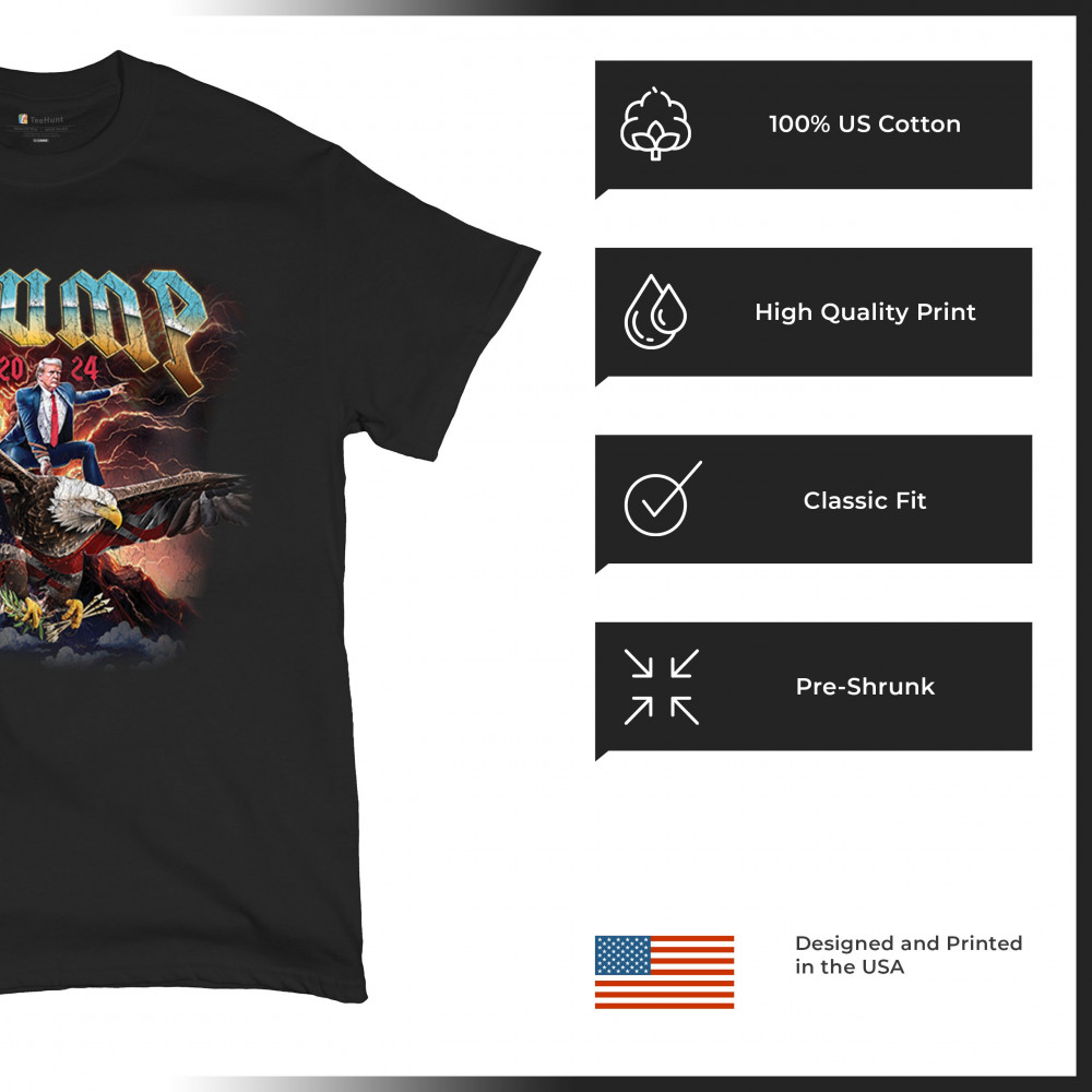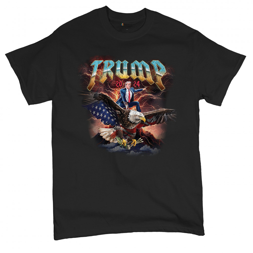 Stand out with our "Trump 2024" design featuring Trump riding an eagle. Perfect for rallies and patriotic events. Show your support with pride and confidence.