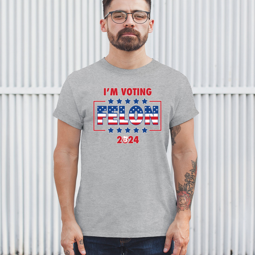 Show your support with the "I'm Voting Felon 2024" design, perfect for conservative patriots and Trump supporters. Featuring an American flag motif.