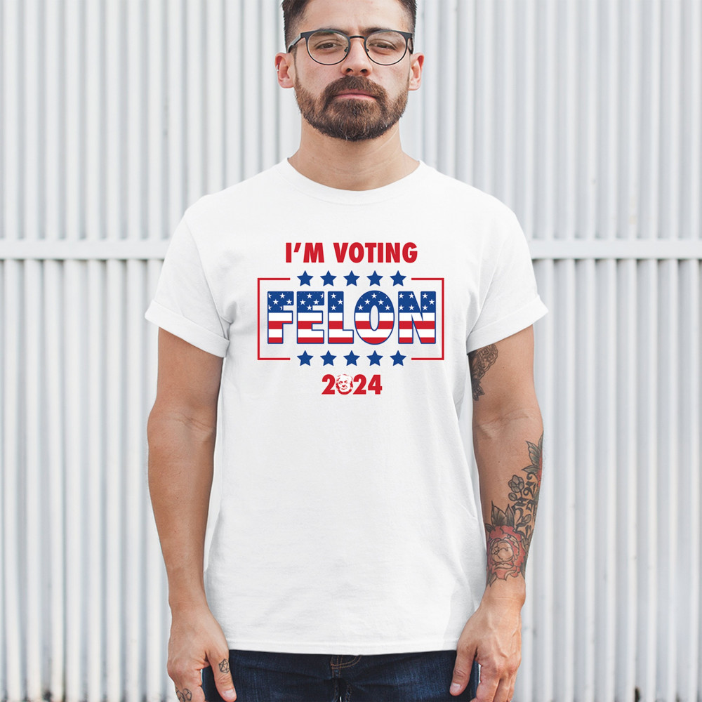 Stand out and express your political beliefs with our "I'm Voting Felon 2024" design. This bold and eye-catching design is perfect for conservative patriots and Trump supporters. Featuring a vibrant American flag motif, it’s ideal for rallies, political events, and daily wear. Show your commitment to America First and your defiance against opposition. This design is a perfect gift for like-minded friends and family who support the same values and are proud to show it.